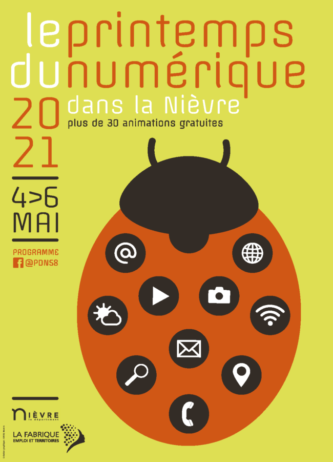 Cette année, le printemps du numérique a lieu du 4 au 6 mai 2021. Avec 4 thématiques : Le numérique dans l’entreprise Nouvelles technologies Promotions des métiers / formation Le numérique au quotidien Découvrez la programmation de plus de 30 animations numériques gratuites en cliquant ici. ℹ Infos et inscription :hors Nevers : mediation.numerique@nievre.frdans Nevers : contact@lafabriquemploi.fr