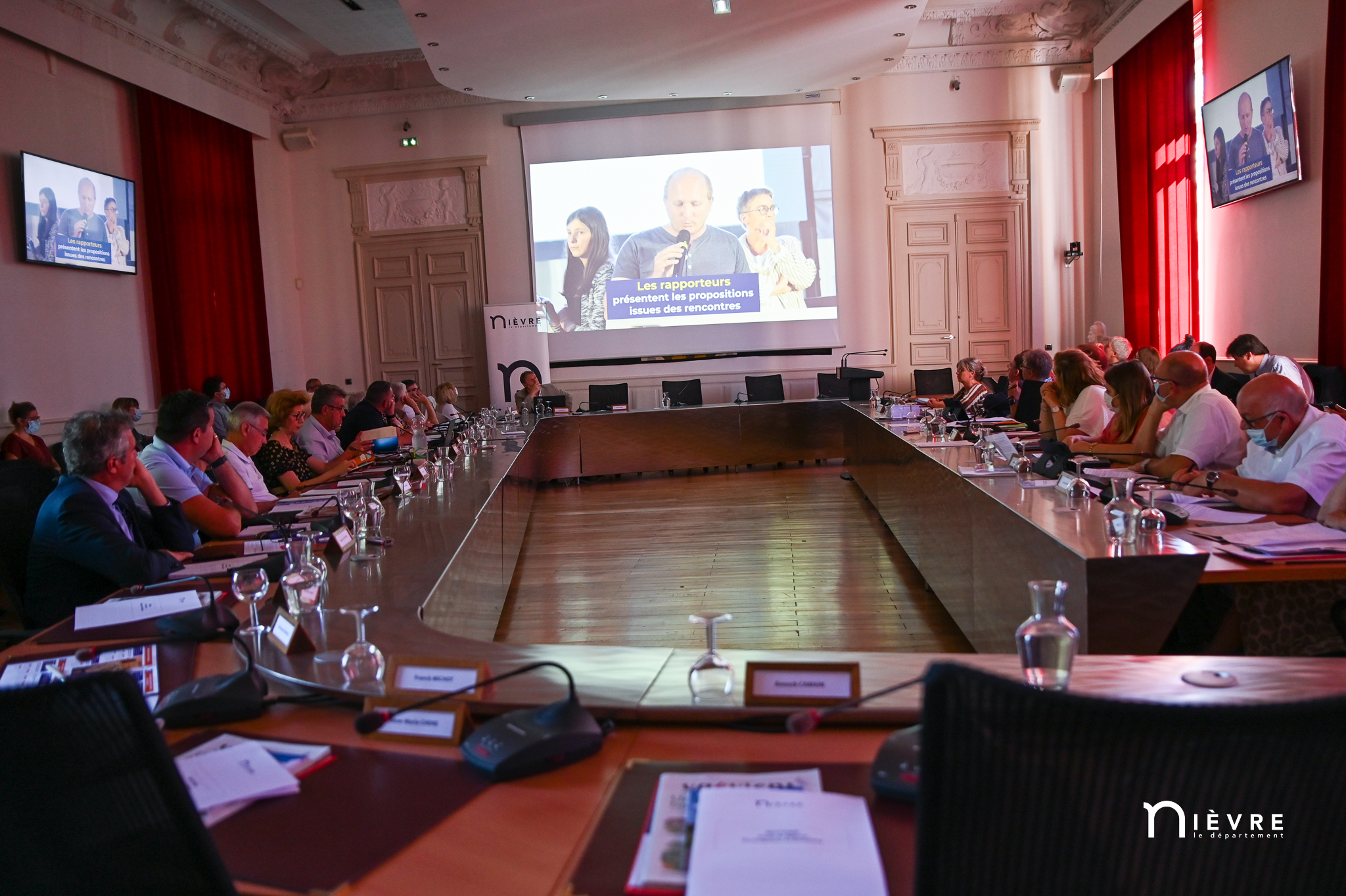 Réunis en session extraordinaire lundi 11 juillet, les élus du Conseil départemental ont étudié en détail les 30 engagements issus d’Imagine la Nièvre ! et présentés en avant-première lors de la journée de restitution de la concertation citoyenne, le 25 juin à Crux-la-Ville. Santé, jeunesse, transition écologique, économie, transports, etc. : le quotidien des habitants sera touché, dans les cinq ans à venir, par la mise en œuvre de ces engagements votés à la majorité ; un observatoire citoyen en suivra les étapes.