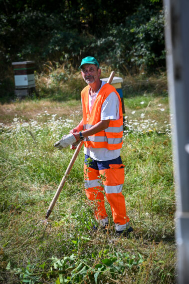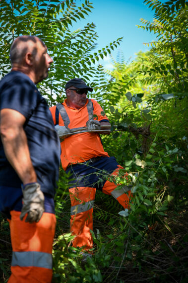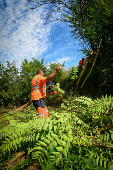 Il est presque 11 heures et le soleil commence à lâcher ses coups sur les Varennes de Tinte. La sueur perle au front des six agents du Centre d’entretien routier (CER) de Decize et de l’alternante du service Patrimojne naturel qui s’échinent depuis 7 heures à arracher les pieds d’ailanthe glanduleux en compagnie de Thibaud Wyon, coordinateur dans la Nièvre du Conservatoire des espaces naturels (CEN) de Bourgogne. Les arbustes longilignes aux feuilles vert vif s’accumulent en tas en contrebas du talus de la voie ferrée qui relie la scierie Bois et Sciages à la ligne Nevers-Dijon.
