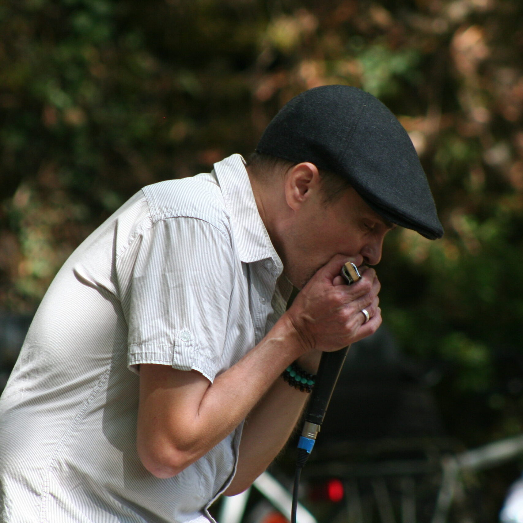 Sur l’esplanade taillée à flanc de colline, entre fleuve et ciel, un soleil de Louisiane perce la canopée et donne des suées à Christophe Hanart, leader de Chris Feeling Bluesband. En ce samedi après-midi torpide, le guitariste chanteur égratigne la sieste charitoise à grands solos brûlants, partageant l’avant-scène avec David Paquet, harmoniciste qui pioche ses instruments dans une vieille valisette pour en tirer d’éblouissantes flammes.