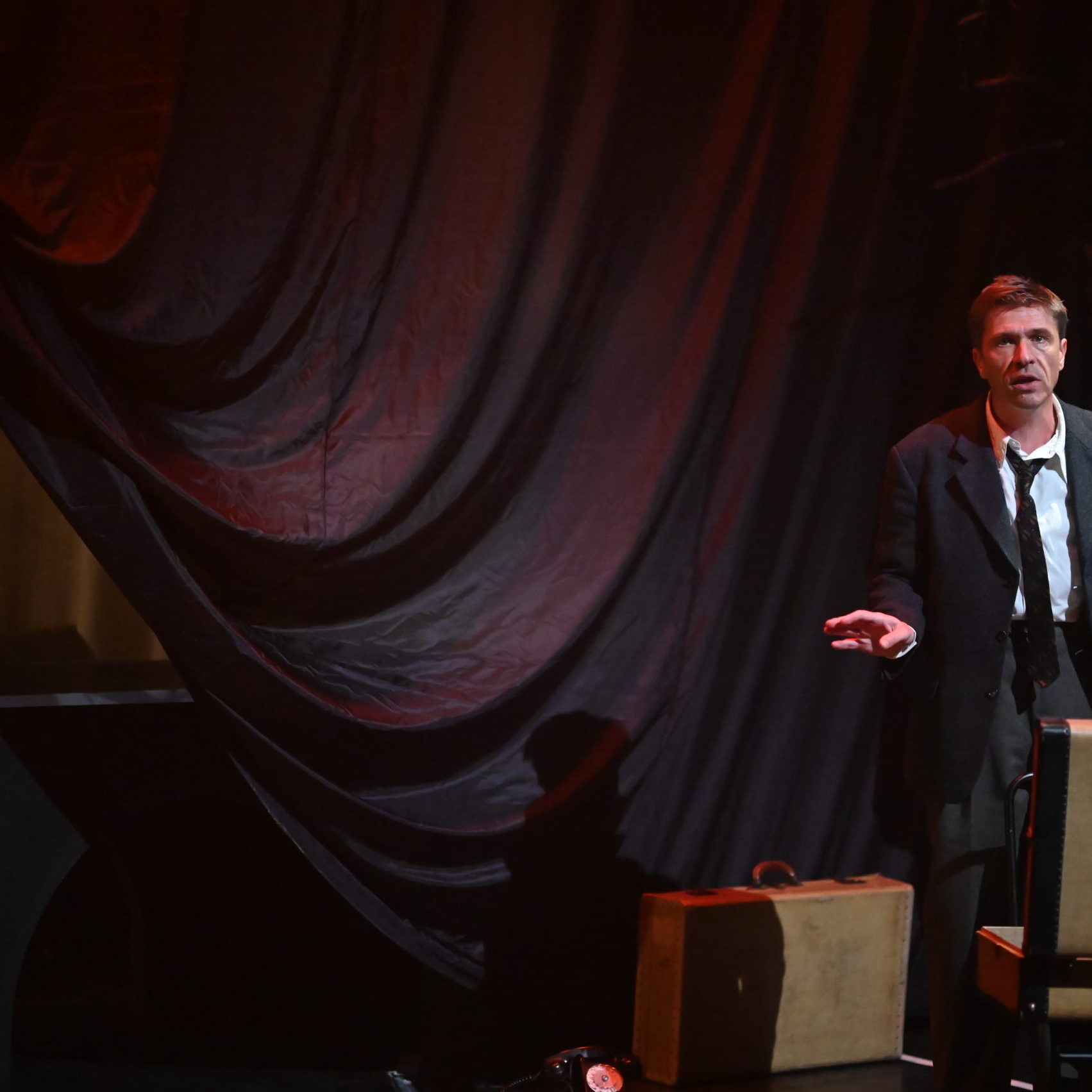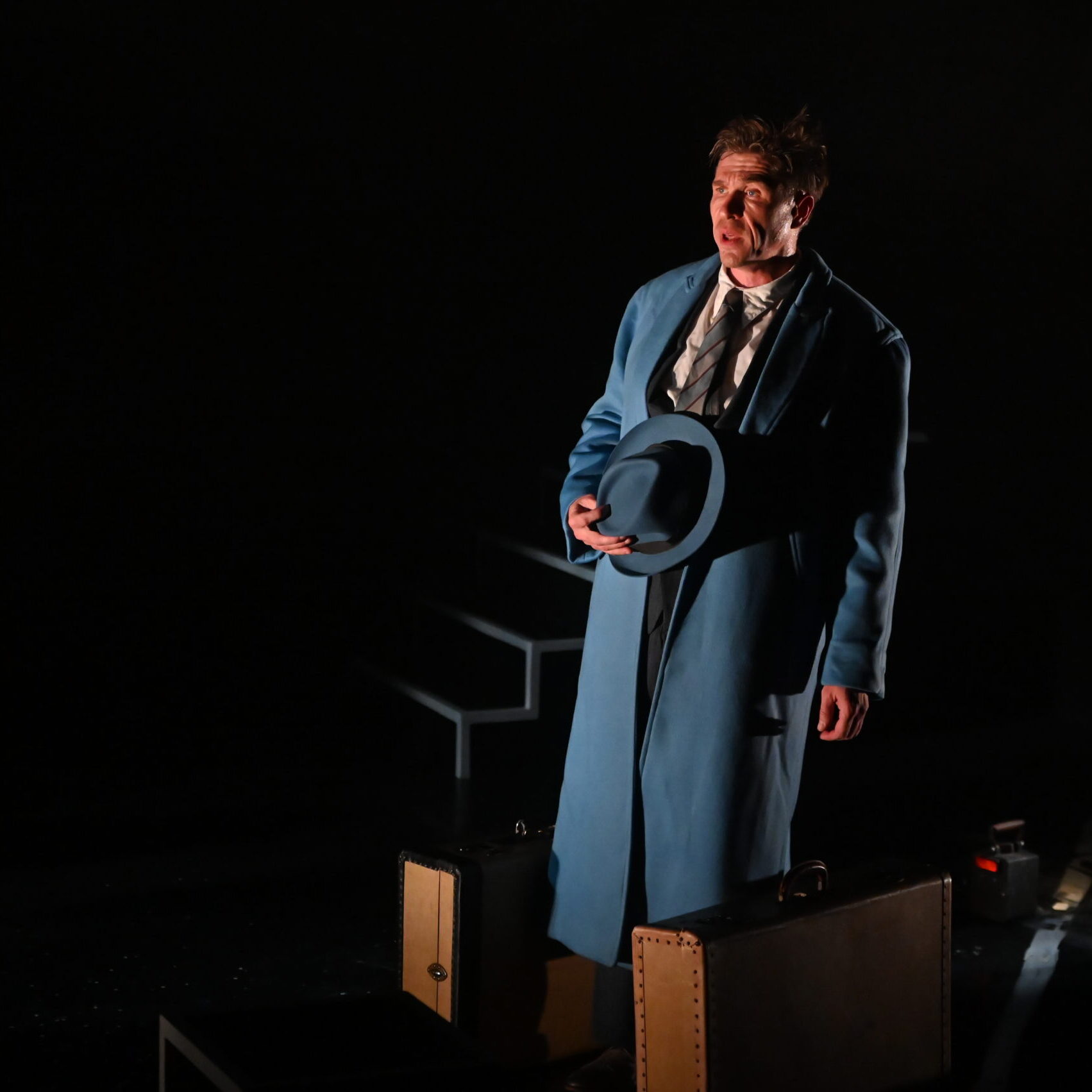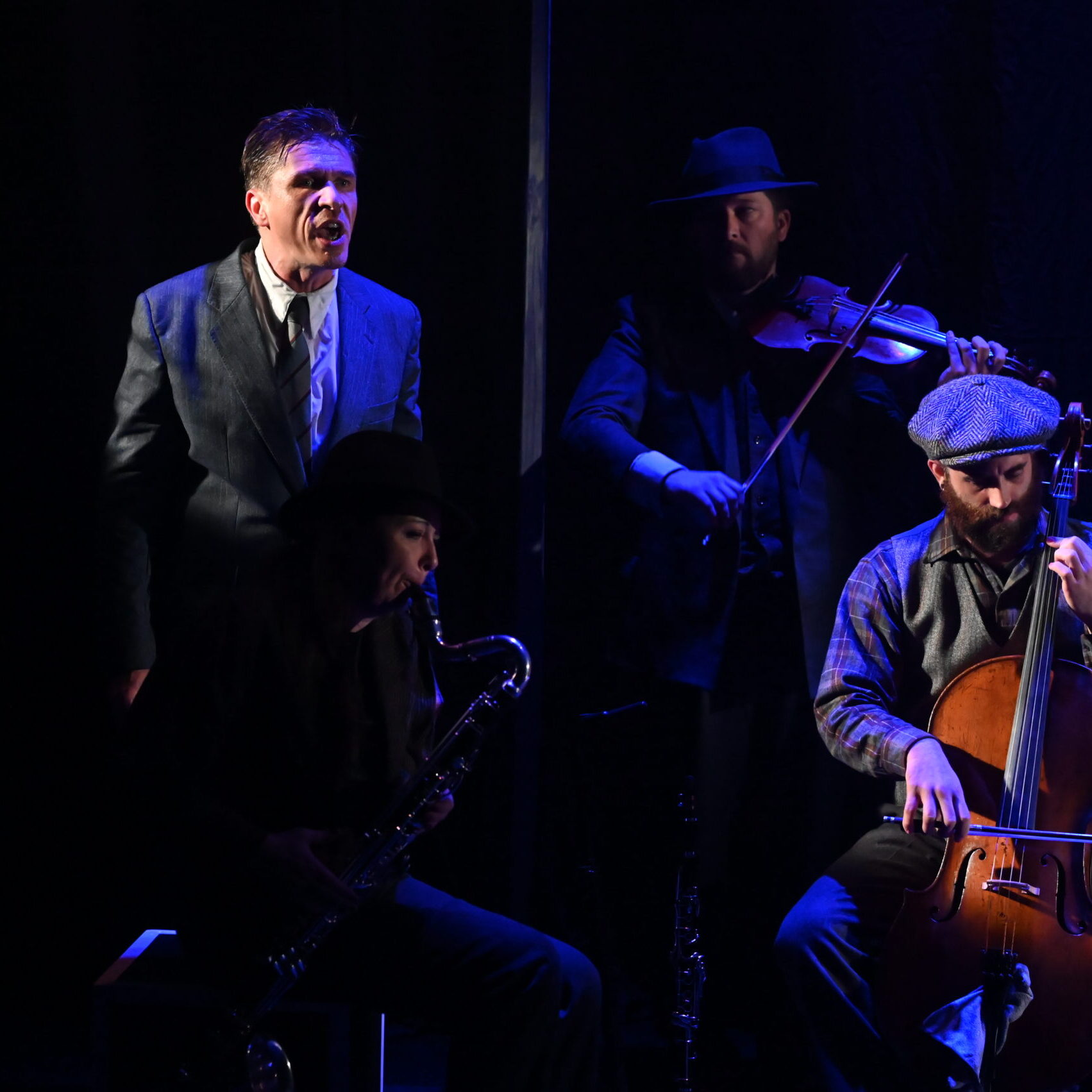 Le comédien alterne lui aussi les rôles, avec aisance et brio, passant de l’un à l’autre sans jamais perdre le spectateur. L’ensemble fonctionne parfaitement et fait son effet. Même le décor s’impose, comme les musiciens sur scène. Volontairement épuré et inspiré du peintre Léon Spilliaert (1881-1946), il marie le noir et les gris, amplifiés par l’éclairage, qui donnent à la pièce une atmosphère sombre et amusante, absurde et réaliste, où la mort peut être belle et libératrice.
