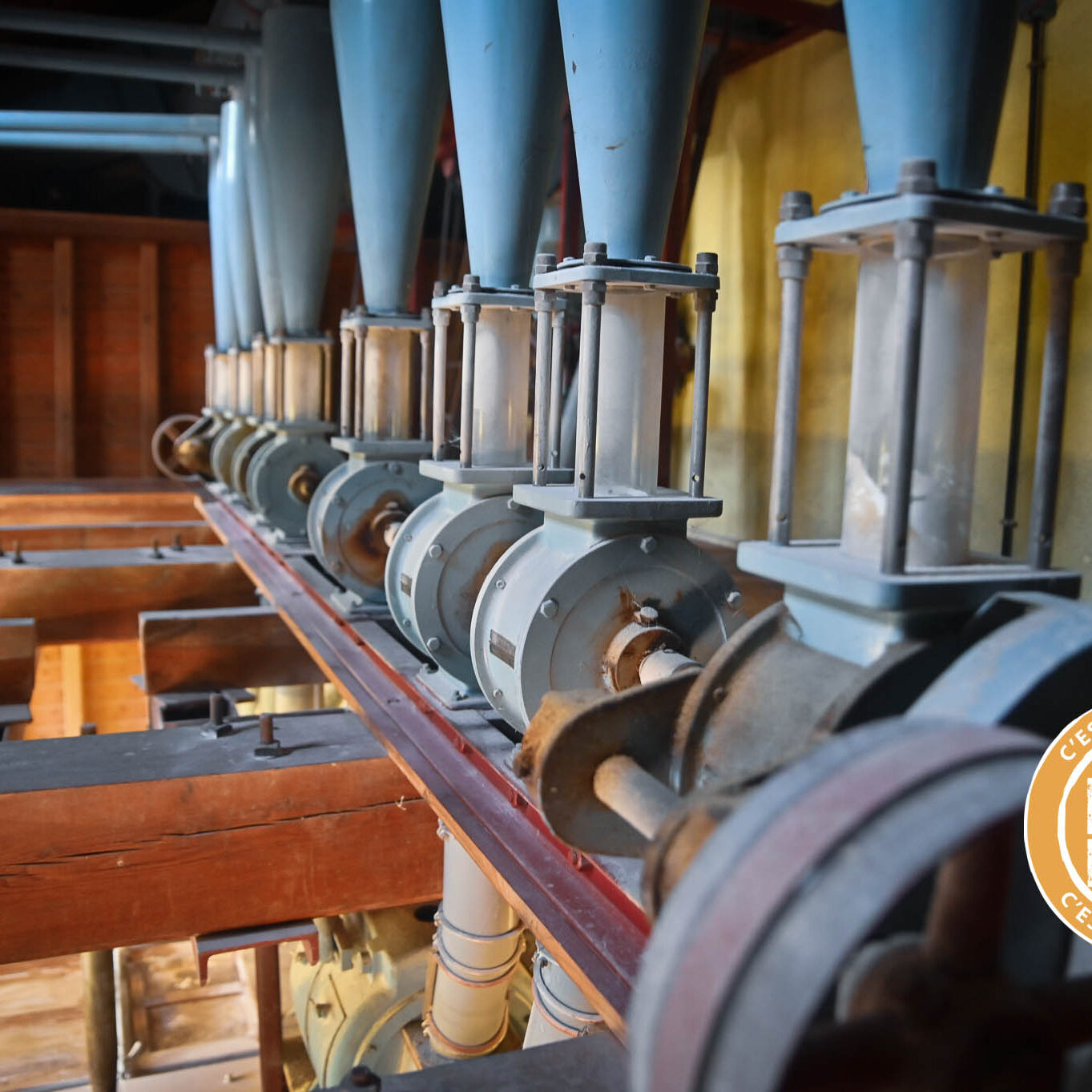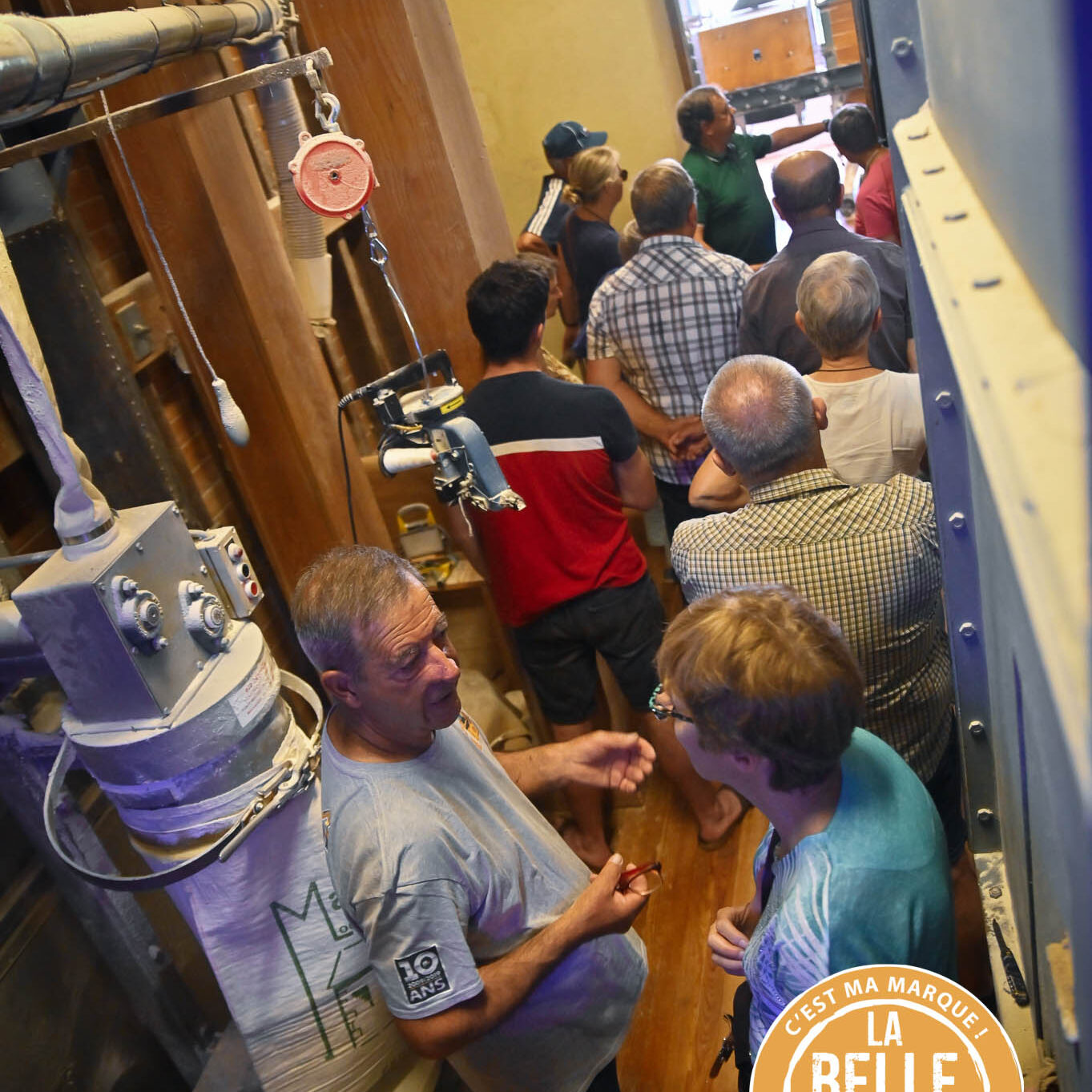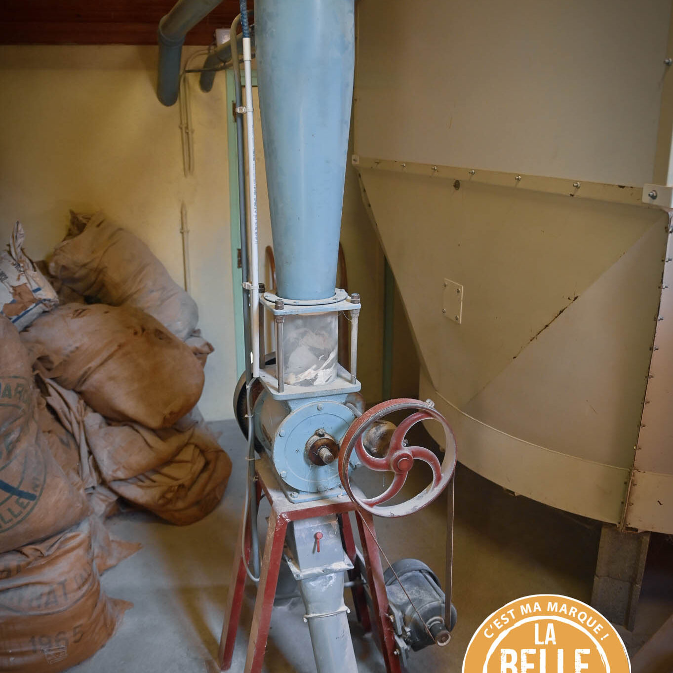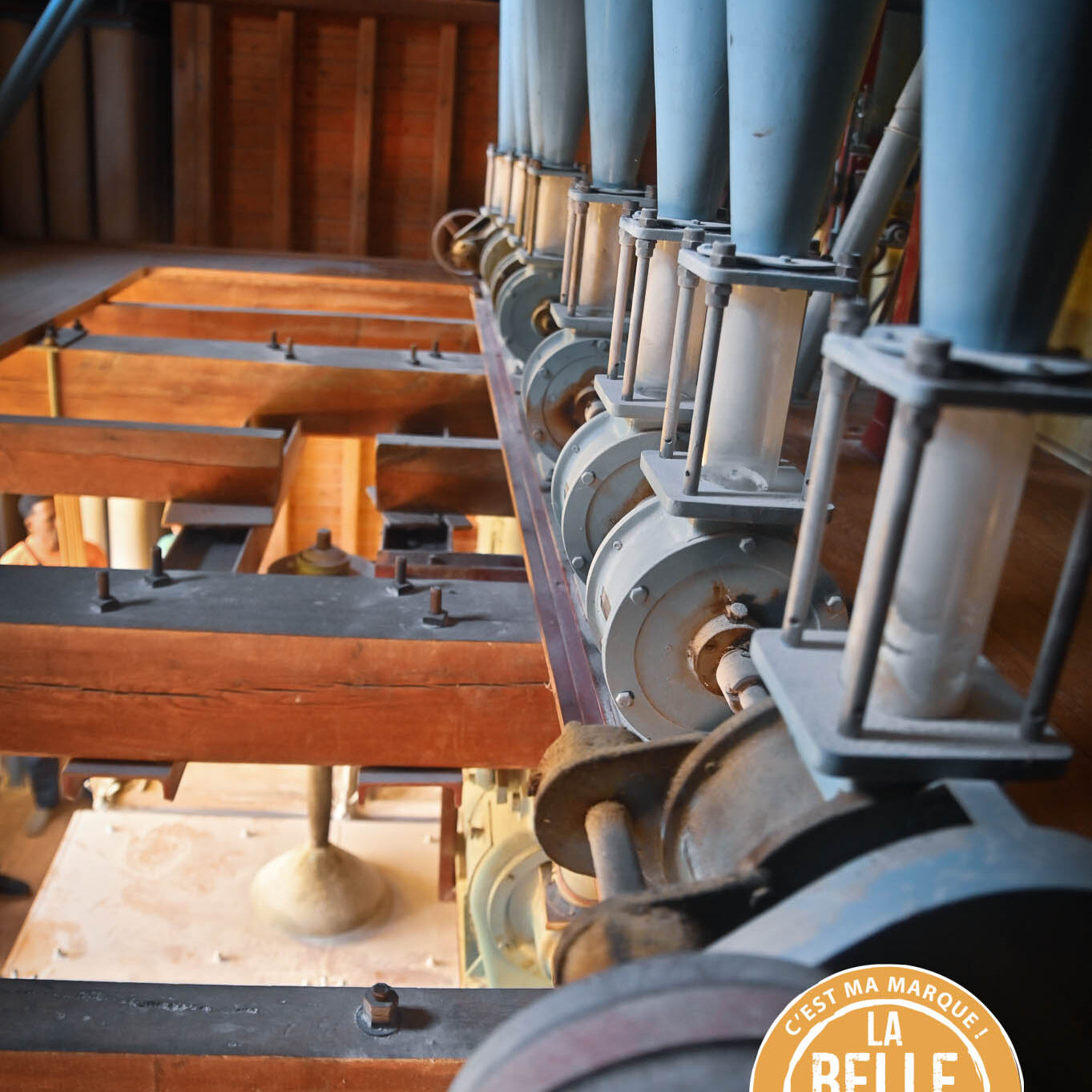 Sylvain Marceau reprend la main et commence la visite. À peine entré dans le moulin, l’odeur prégnante de la farine, plutôt agréable, se glisse dans les moindres interstices, au sens propre comme au sens figuré. La poussière de farine est omniprésente ; quoi que l’on touche, nous voilà recouverts de minuscules particules. Un système complexe d’aspiration, de tuyaux en tout genre et de machines occupe tout l’espace.