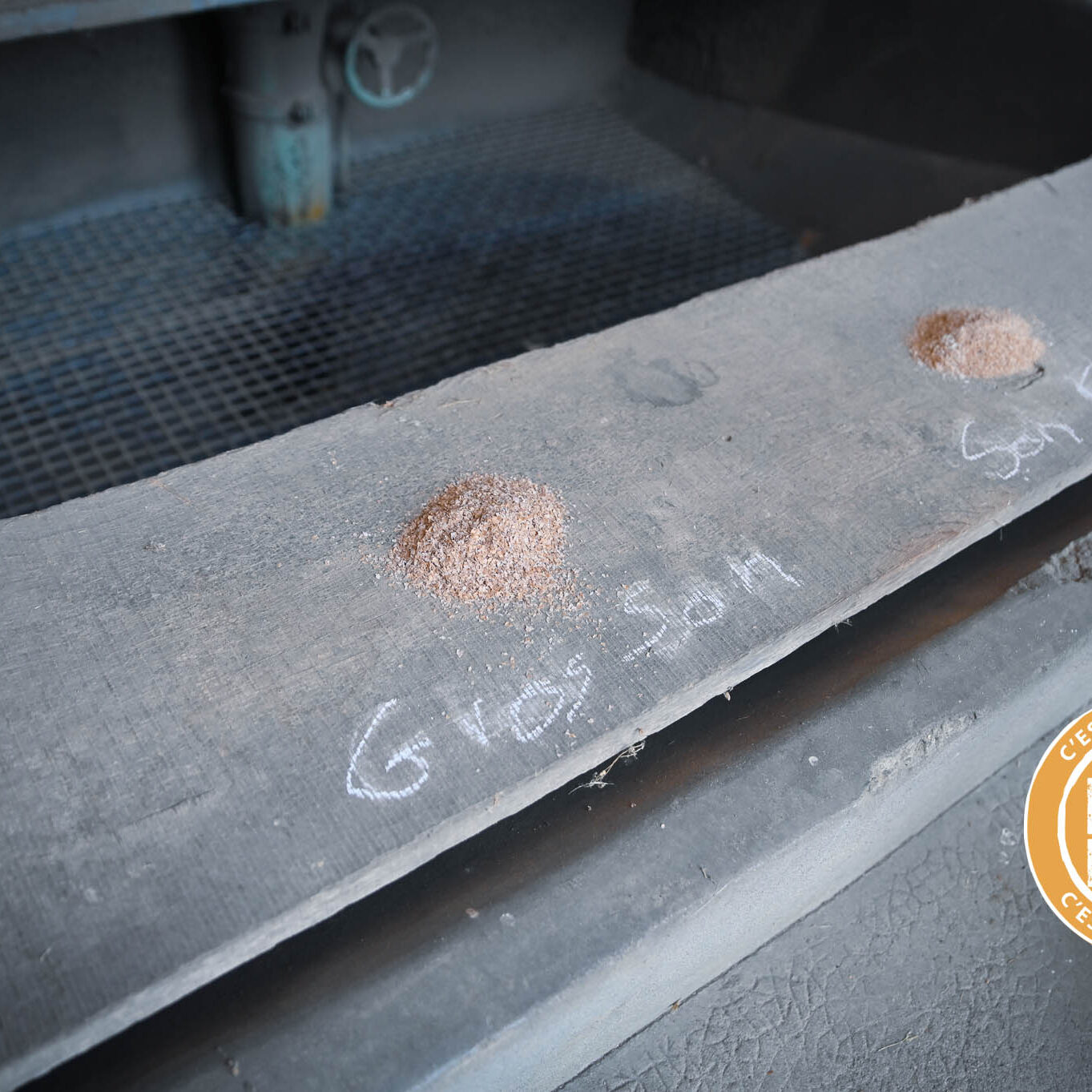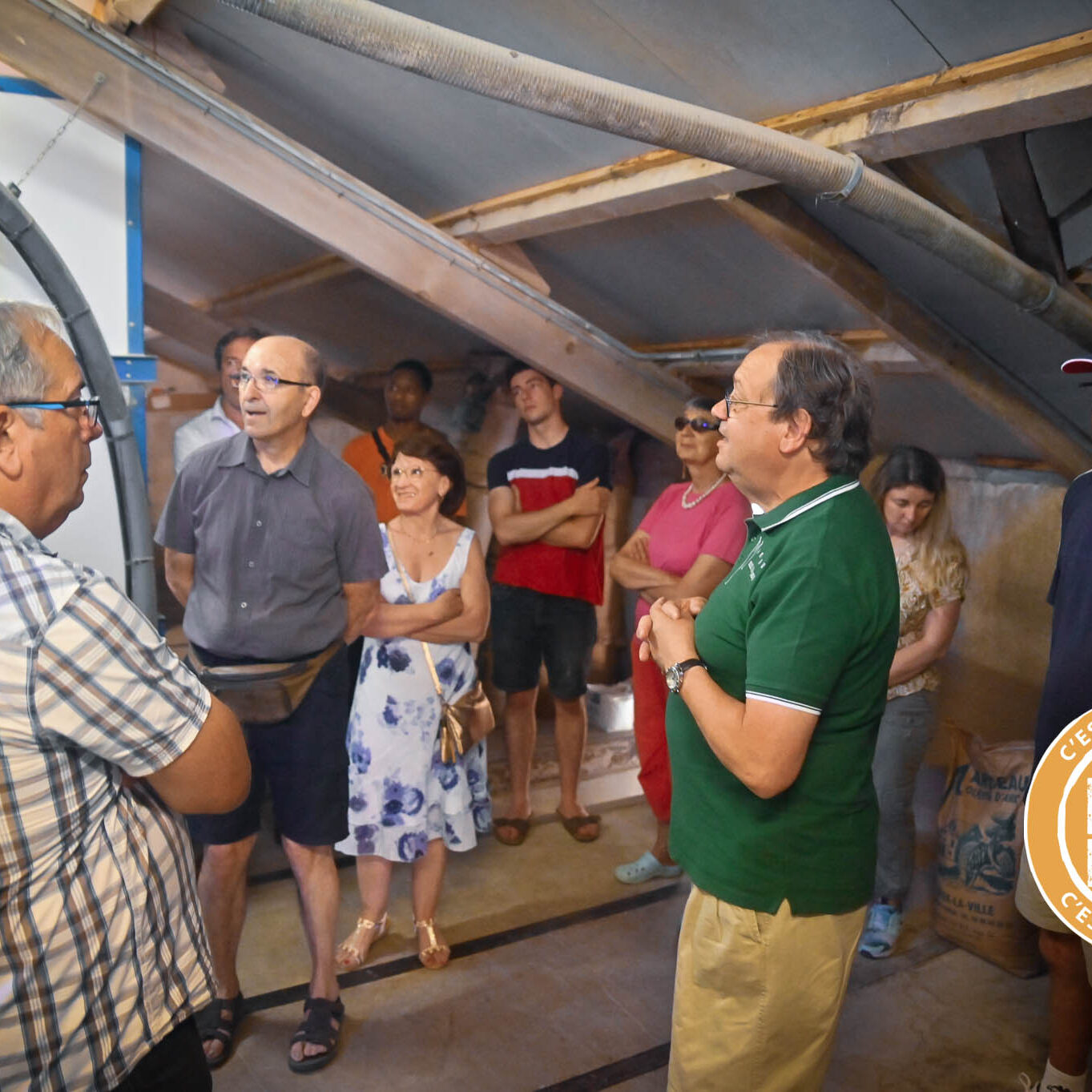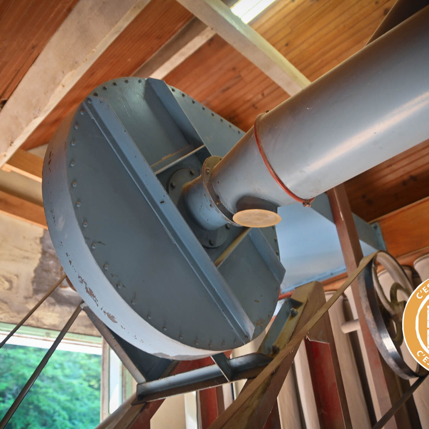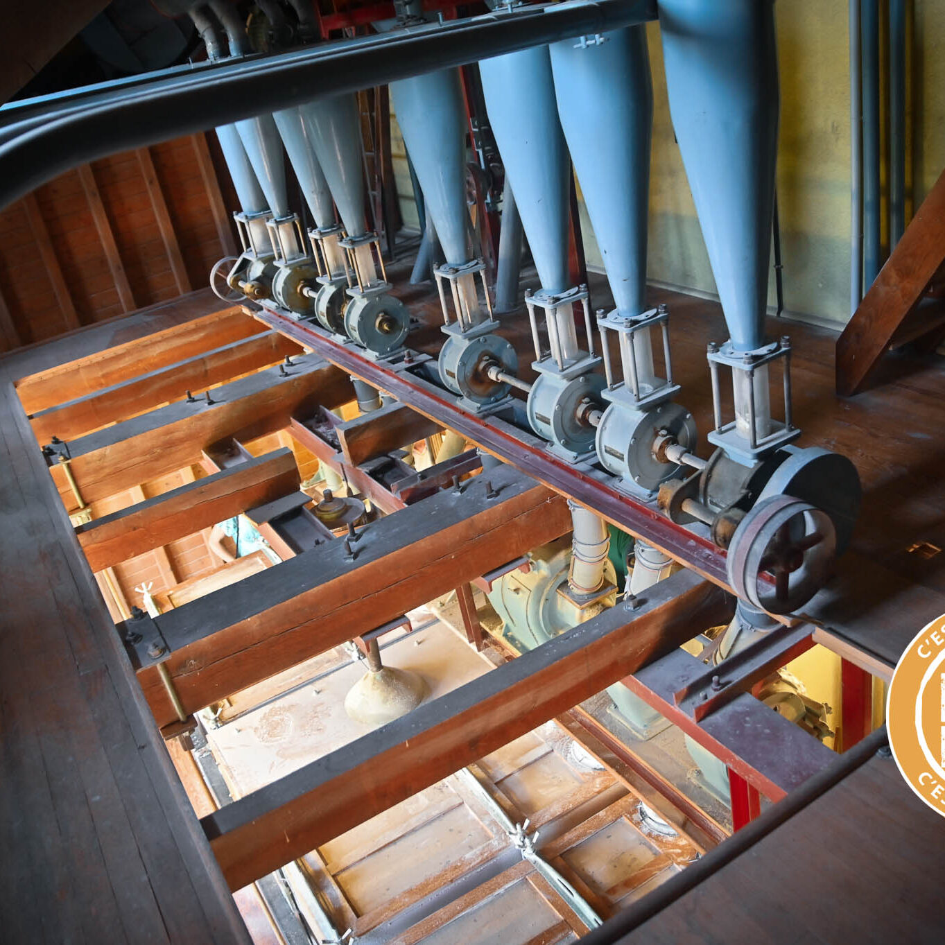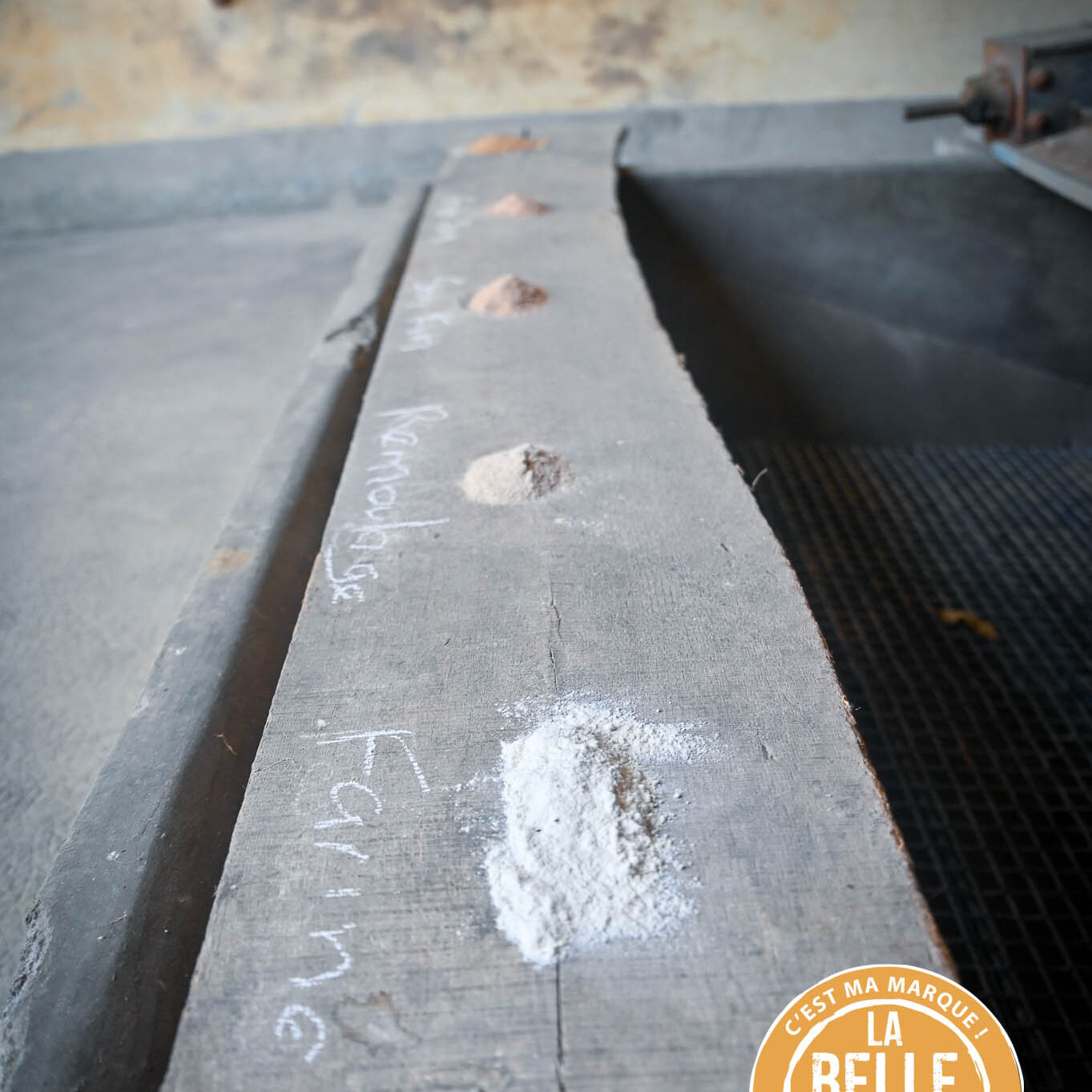 Sylvain Marceau reprend la main et commence la visite. À peine entré dans le moulin, l’odeur prégnante de la farine, plutôt agréable, se glisse dans les moindres interstices, au sens propre comme au sens figuré. La poussière de farine est omniprésente ; quoi que l’on touche, nous voilà recouverts de minuscules particules. Un système complexe d’aspiration, de tuyaux en tout genre et de machines occupe tout l’espace.
