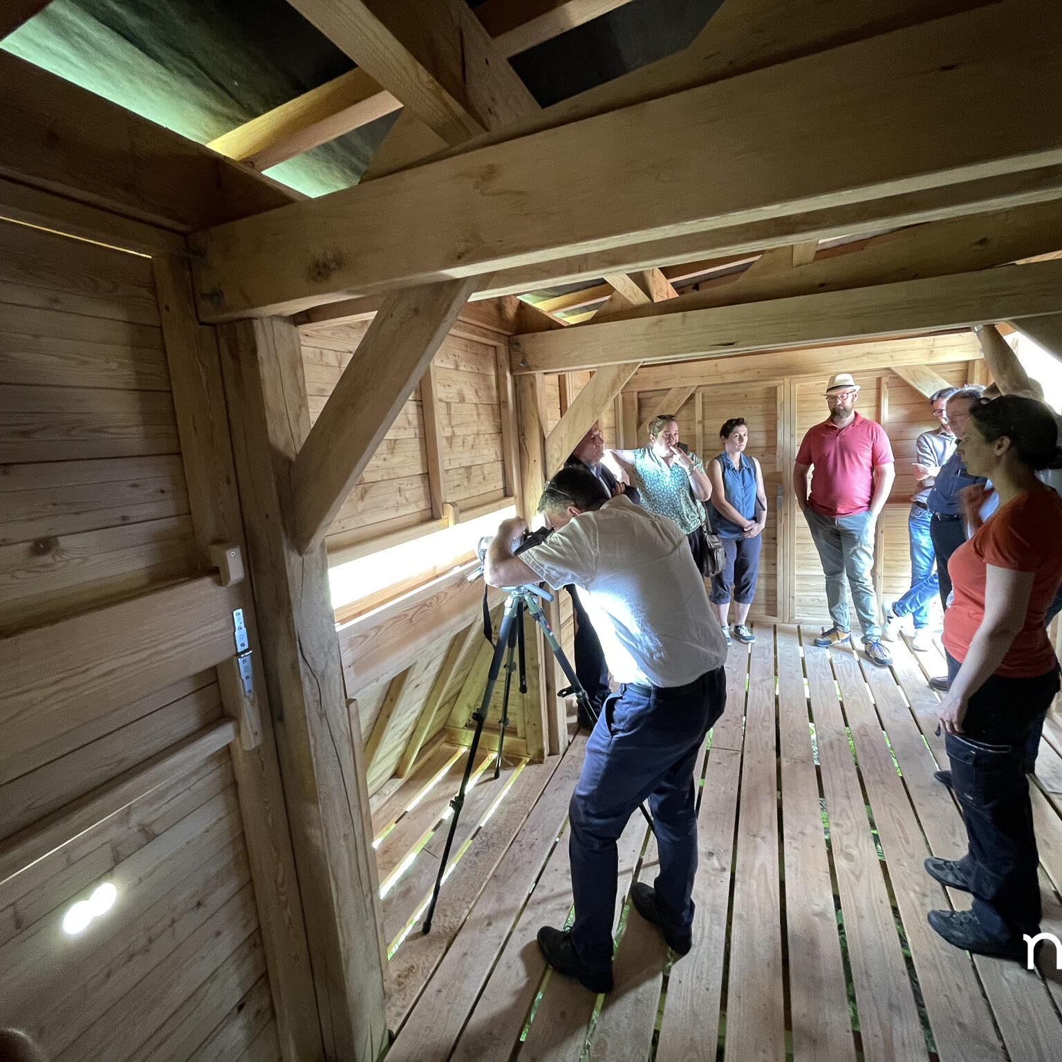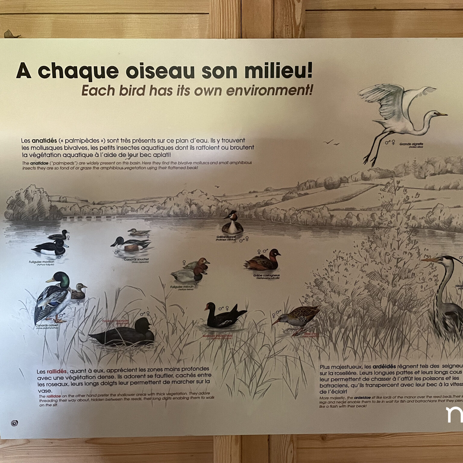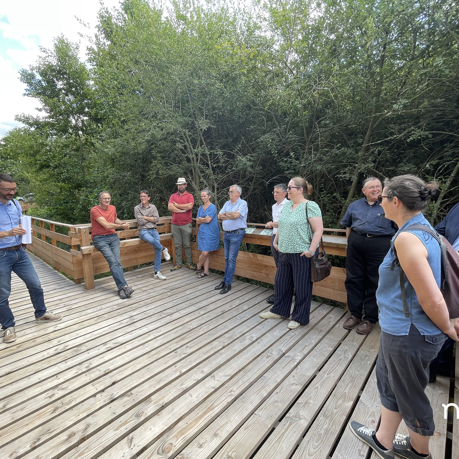 Impatiente ne-me-touchez-pas et ses fleurs explosives, mégaphorbiaie (friche humide), autochorie (dissémination brutale des graines par la plante) : les acteurs de l’inauguration ont droit à un plaisant quiz du service Patrimoine naturel du Département, avant de rejoindre l’observatoire. Ses ouvertures horizontales, aussi étroites que des meurtrières, invitent à plonger discrètement le regard sur les roselières et le lac, un peu plus loin. Colverts, cygnes tuberculés, foulques, grèbes huppés révéleront leur présence à qui sait attendre… Et observer, derrière un appareil photo, des jumelles ou une longue-vue. Les roselières offrent même une cachette et un nid appréciés d’un « oiseau rare », le râle d’eau.