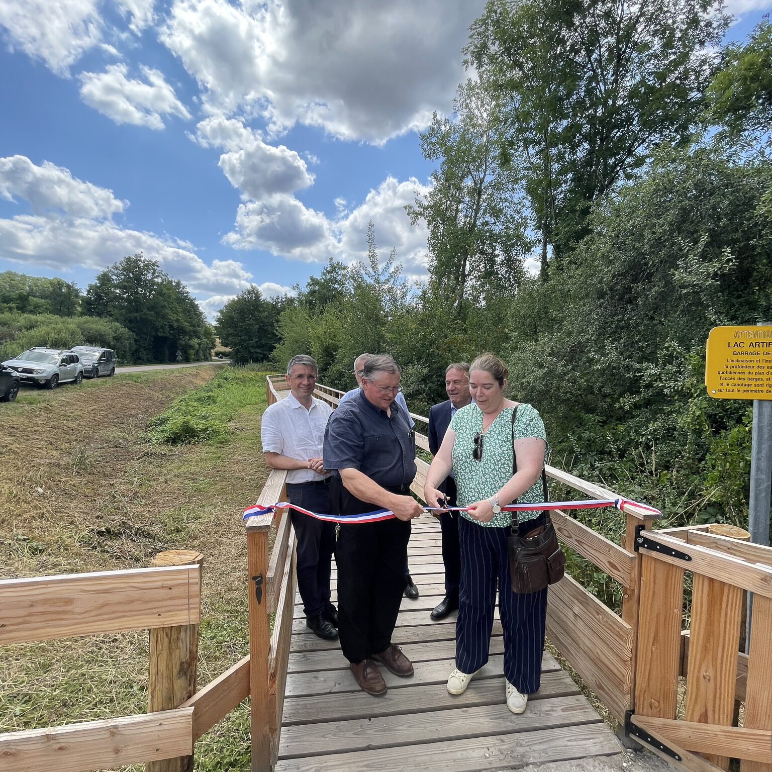 La passerelle respire le bois frais et brut. Le ruban qui barre son entrée d’un grand sourire tricolore atteste l’aménagement récent et l’inauguration imminente. En ce 13 juillet, le sentier pédagogique du Petit lac de Pannecière est foulé par une cohorte d’élus (1), de professionnels et d’agents du Département venus voir le fruit de trois mois de travaux (voir encadré) et, surtout, s’accorder une immersion dans cette jungle d’arbres vivants et morts qui s’est formée, au fil des ans, sur le pourtour de ce bassin de compensation du « grand lac ».