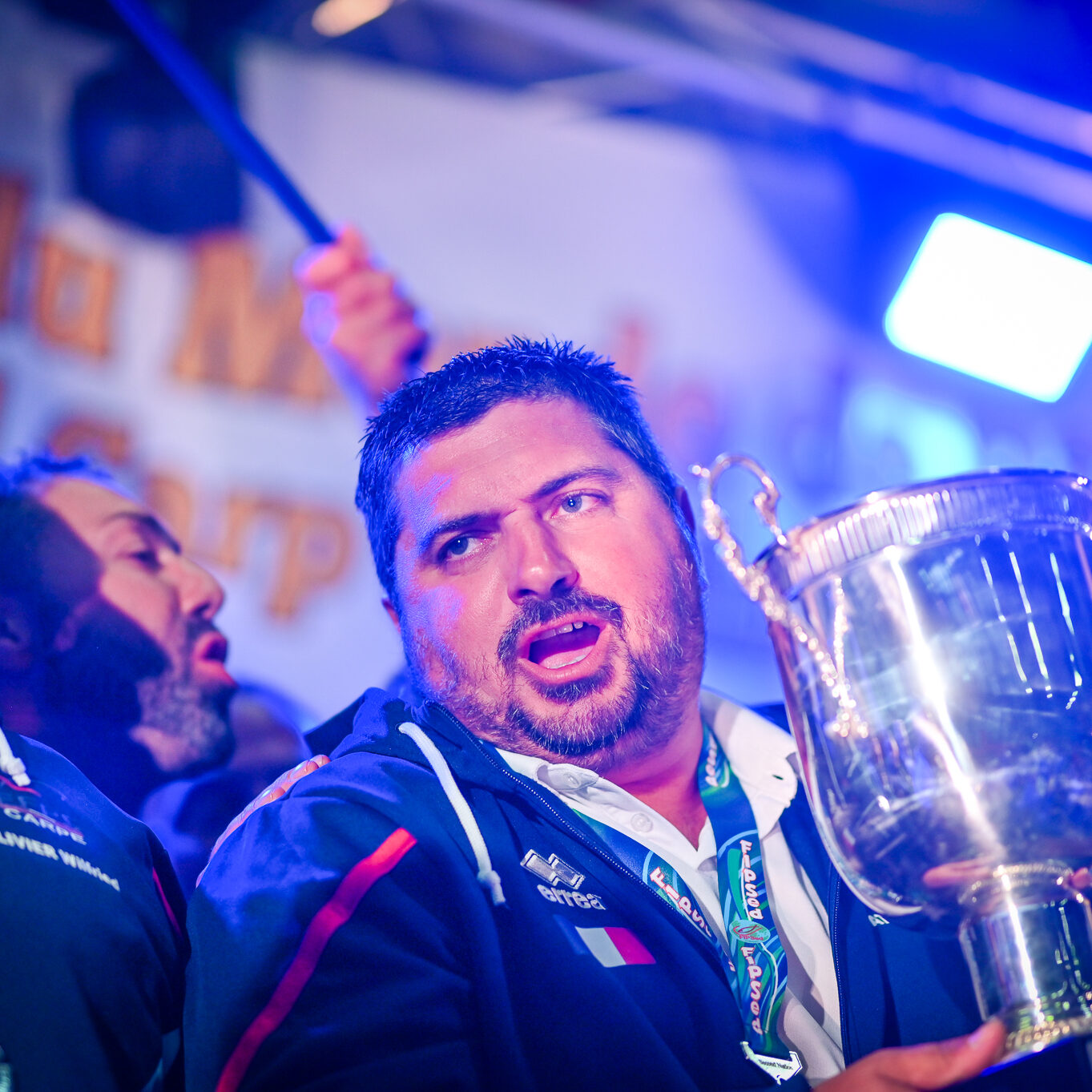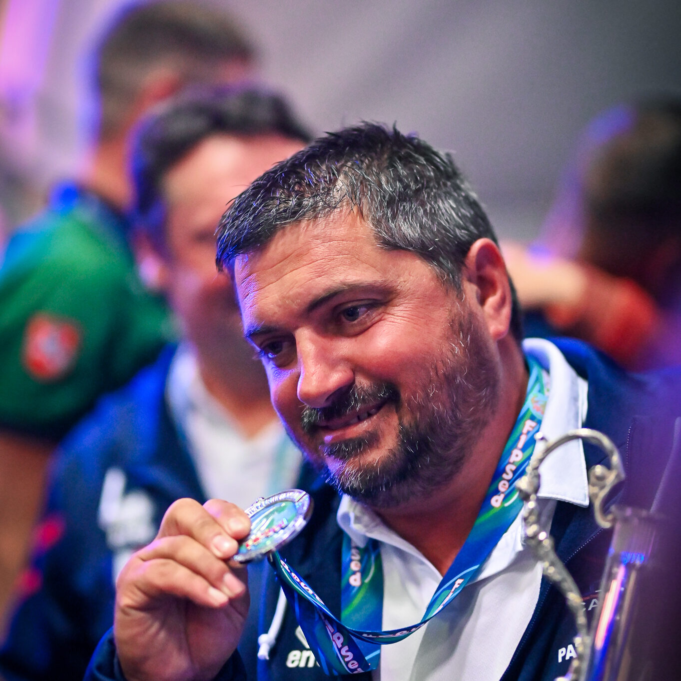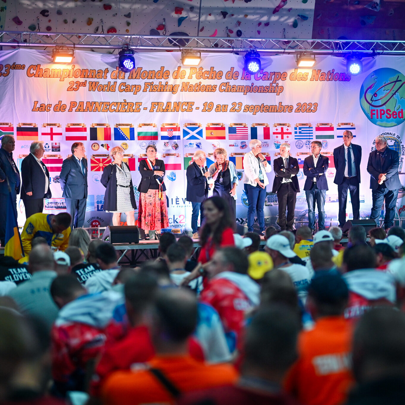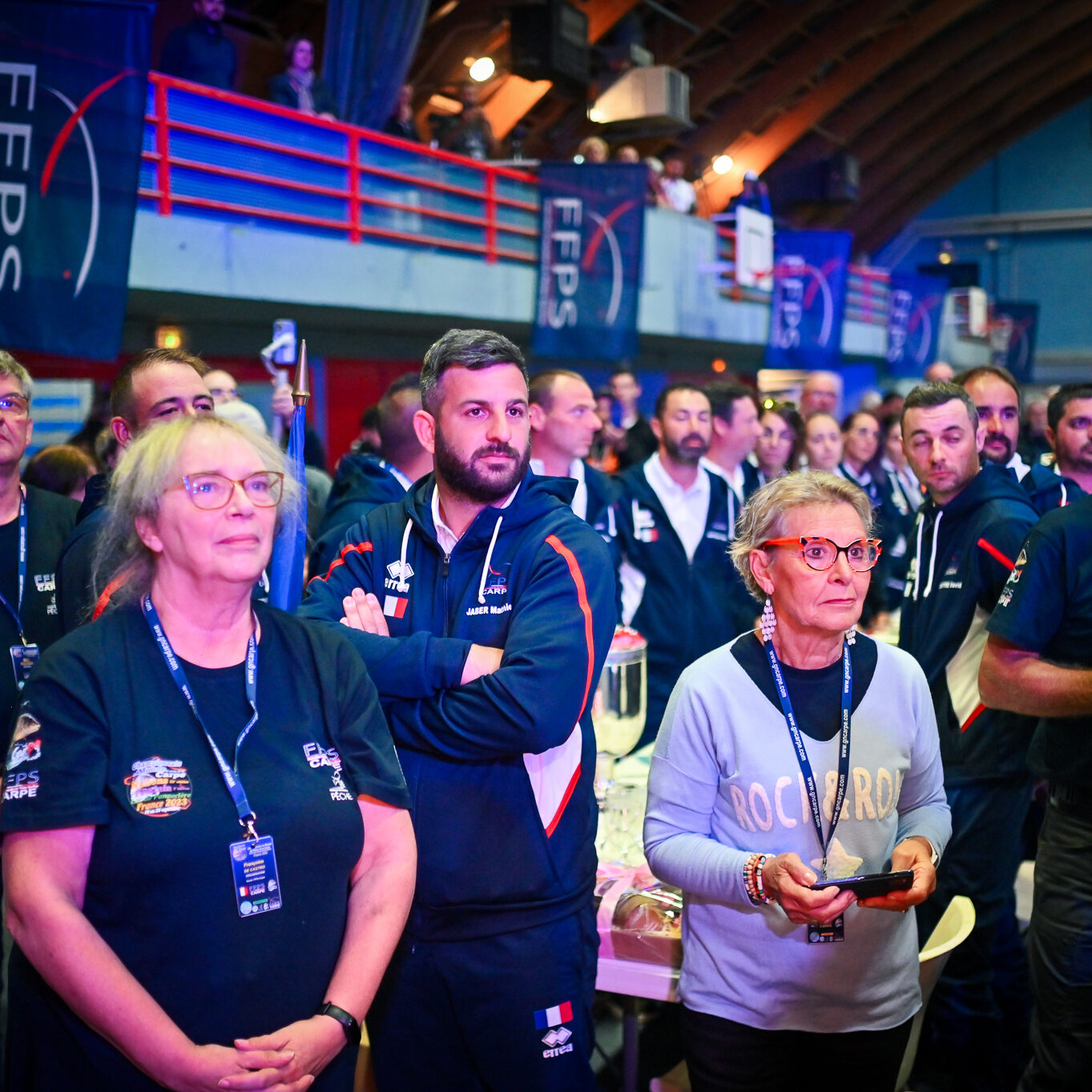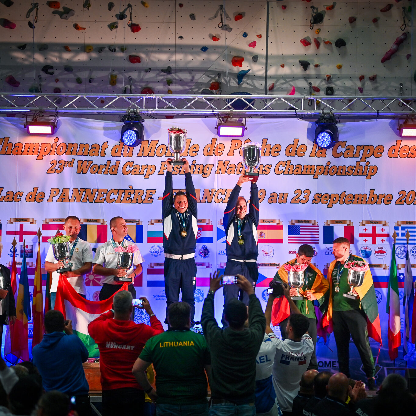 En attendant, tous deux savourent, reçoivent fièrement les félicitations, les tapes amicales et les demandes de selfies des adversaires. Et se lâchent, enfin, sur la plus haute marche du podium, énorme coupe dans une main, un bouquet de fleurs dans l’autre, et s’époumonent sur la Marseillaise. Dans la salle, les 32 délégations, les bénévoles, les officiels et les partenaires sont au coude à coude autour des tables : « On a réuni 32 nations, c’est un record qui sera difficile à battre », souligne Jacques Goupil, président de la Fédération française de pêche sportive. Son vice-président coordinateur de l’organisation, Fernand de Castro, fait applaudir les 150 bénévoles : « Sans vous, on n’aurait rien pu faire. »
