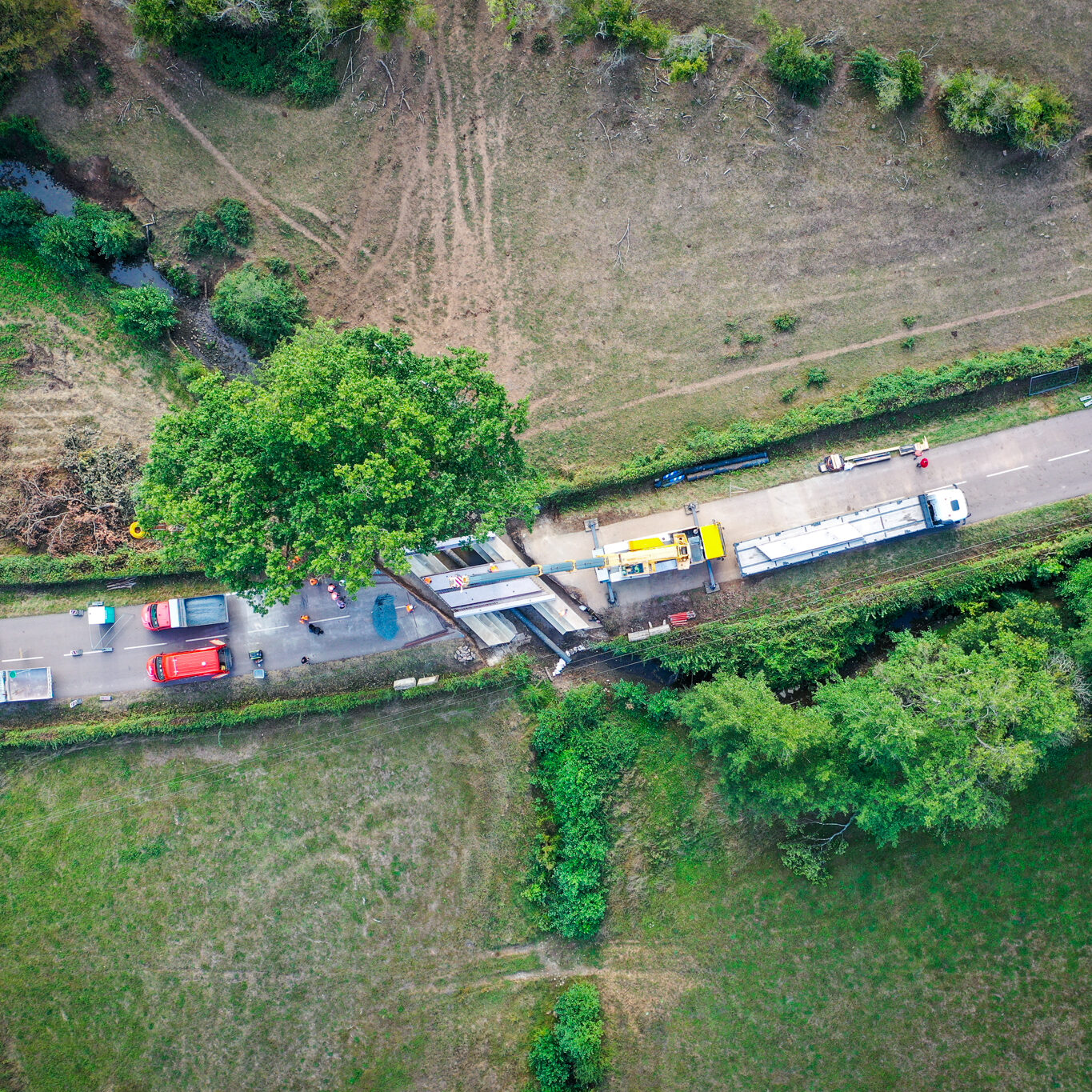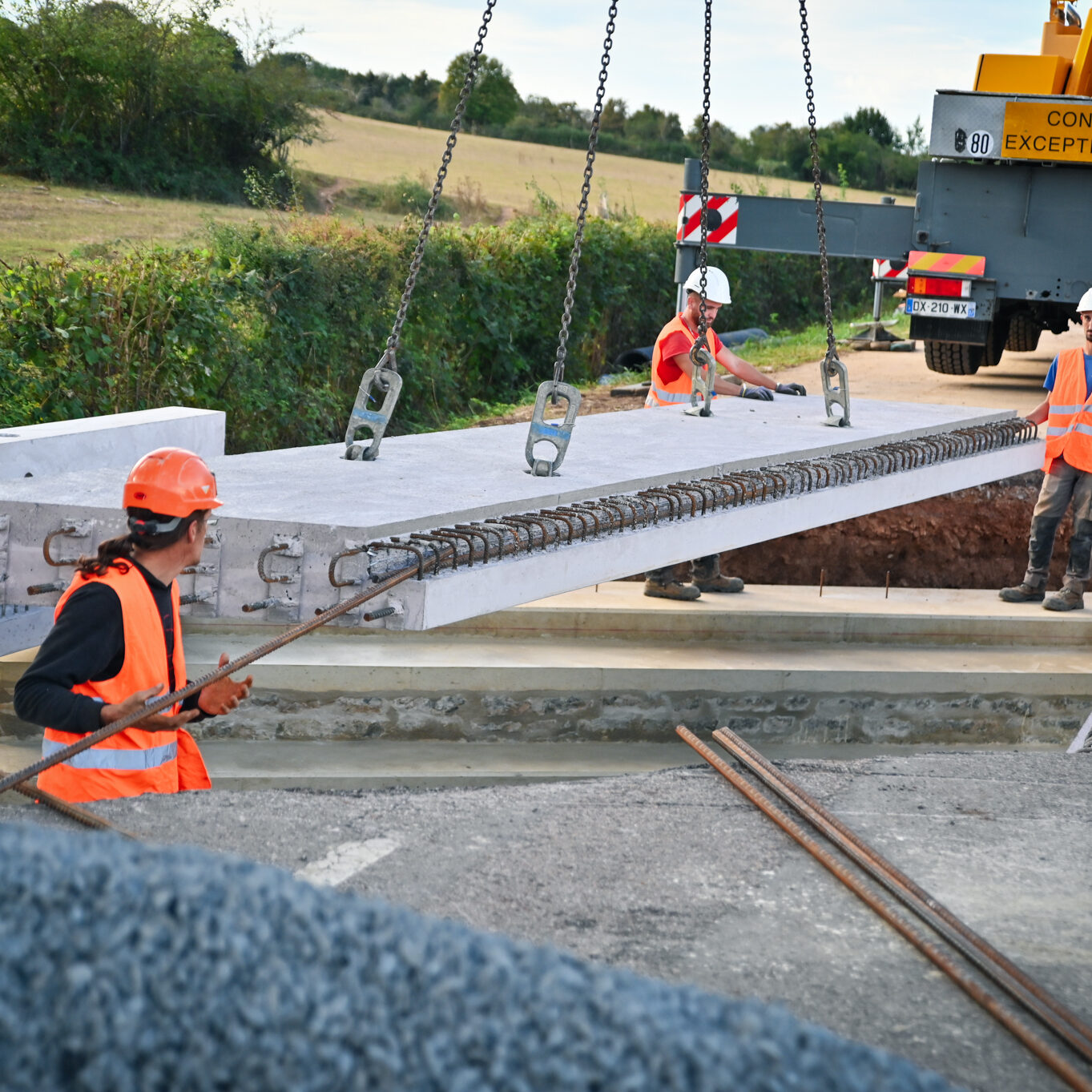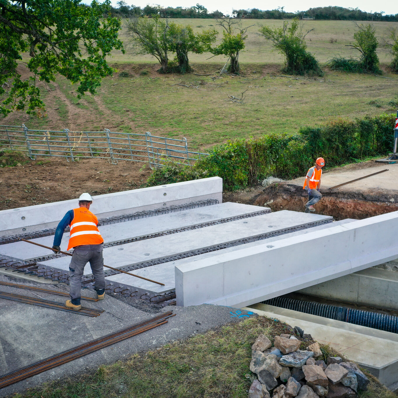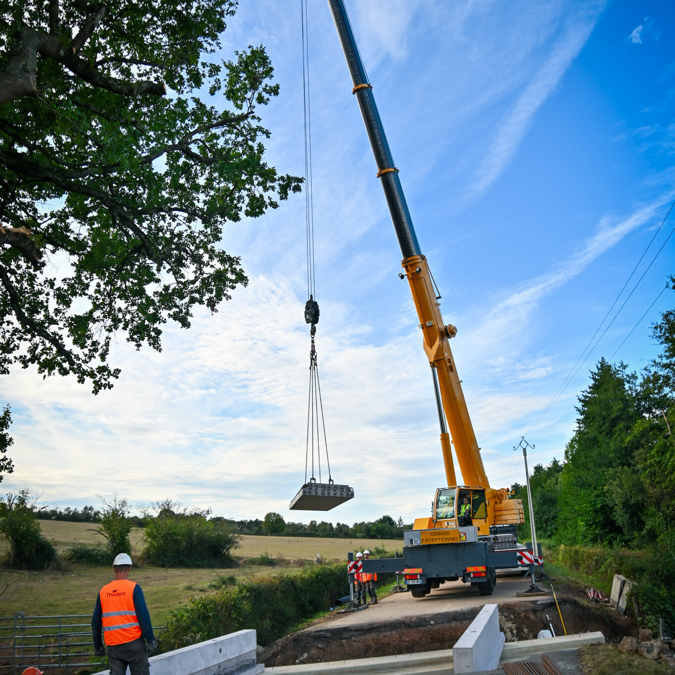 Parallèlement à une surveillance renforcée, à l’affût d’un délabrement accéléré qui aurait nécessité la fermeture de la route, le service Ouvrages d’art du Département s’active pour dessiner le nouveau pont et en définir la structure, en coopération avec l’entreprise Thivent. Dans ses ateliers de Saône-et-Loire, la société de travaux publics a fabriqué les éléments en béton armé, dont la pose a nécessité l’intervention d’une imposante grue, et la coupure du courant sur la ligne bordant la chaussée, le 21 septembre. Le pont a été doté d’une banquette à loutres, un aménagement qui évite à ces animaux – et à d’autres – de (tré)passer sur la chaussée.