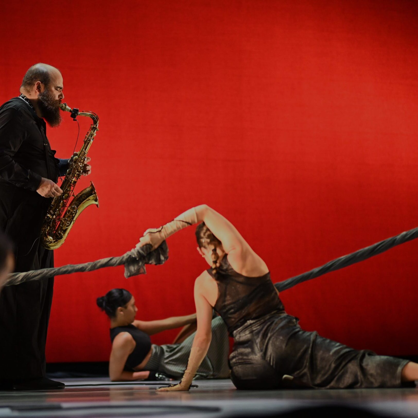 Tout commence dans la pénombre, le souffle émis par le saxophone est à peine audible, comme un battement de cœur, il donne le tempo aux danseurs qui évoluent lentement. Puis l’impulsion s’accélère, les danseurs se réveillent et la lumière se révèle. Un impressionnant ballet virevoltant se met en place. Les entrechoquements et les entremêlements des danseurs répondent au saxophone de Raphaël Imbert et aux arrangements de Benjamin Lévy, en partie improvisés.