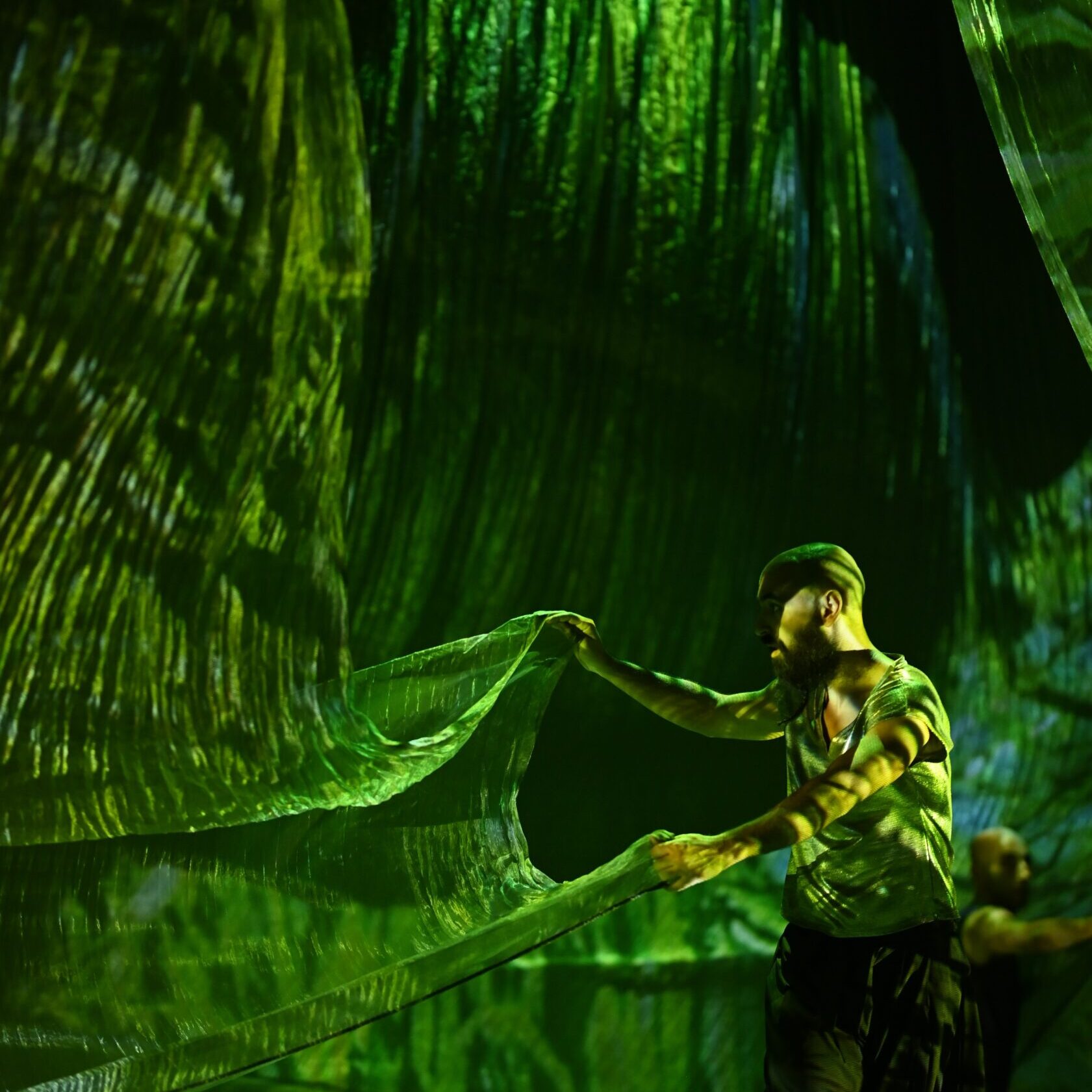 De grands voiles translucides, mais suffisant opaques, servent d’écran où des images d’une nature luxuriante sont projetées. Les effets de lumières sur les voiles donnent à l’ensemble un effet de scintillement. Les émotions ressenties se contredisent ; tantôt inaccessible, tantôt d’une grande lucidité, le spectacle reste néanmoins, pour les néophytes ou pour les experts, un moment touchant et émouvant rempli de mystère.