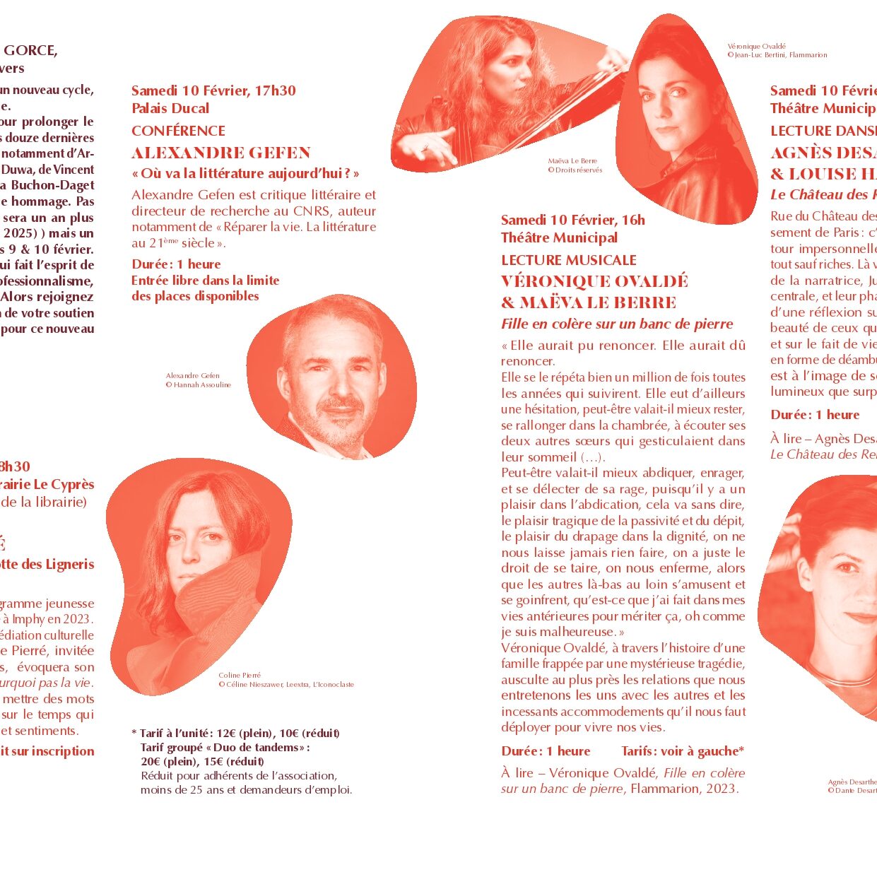 Vendredi 9 février, à 16 h et 19 h, au Petit Théâtre, le public découvrira deux duos, des créations originales, avec notamment une lecture musicale et une lecture dansée. Autre rendez-vous à retenir, à 17 h 30 au Palais ducal, la rencontre-débat Où va la littérature ? avec Alexandre Gefen, critique littéraire et directeur de recherche au CNRS, auteur notamment de Réparer la vie – la littérature au XXIᵉ siècle.