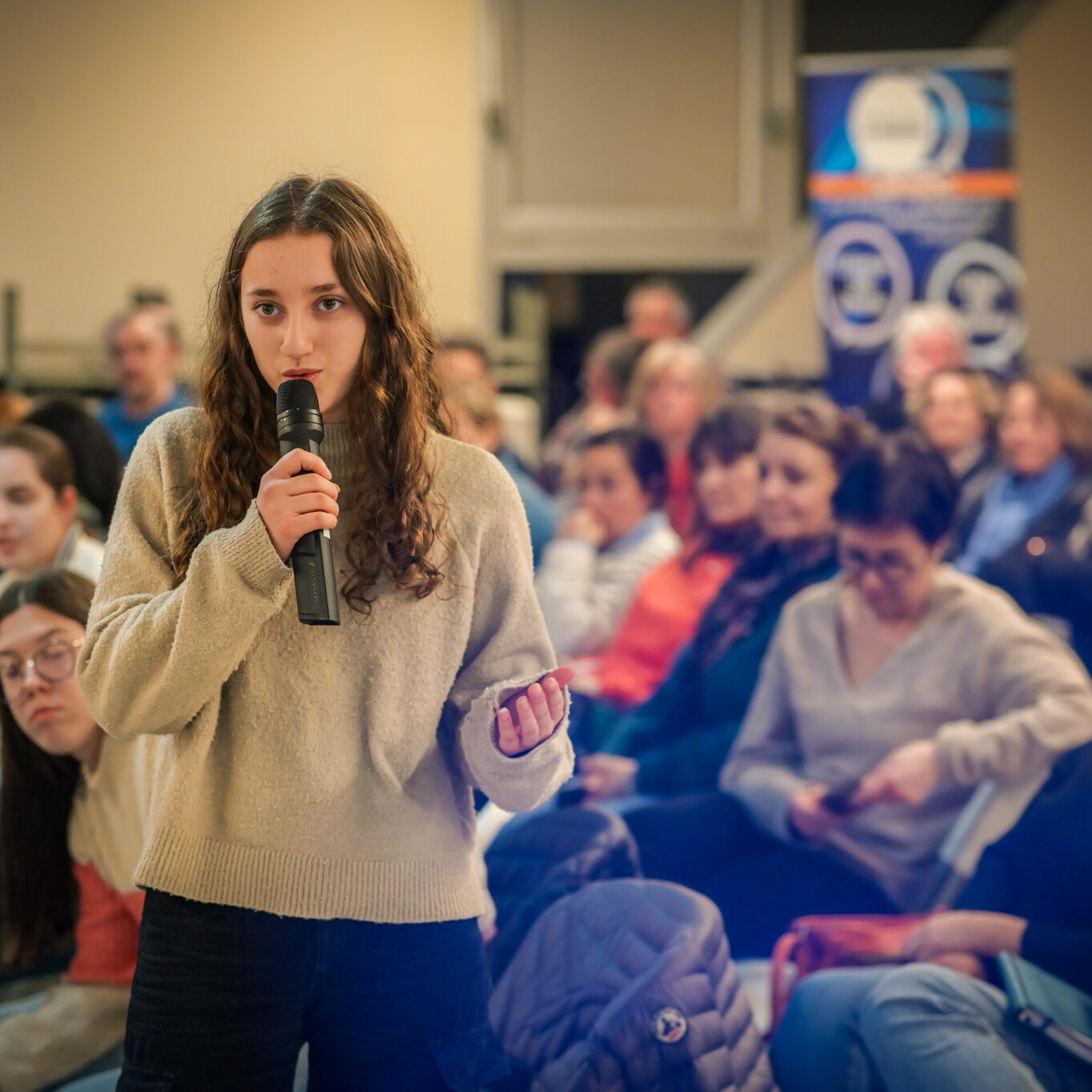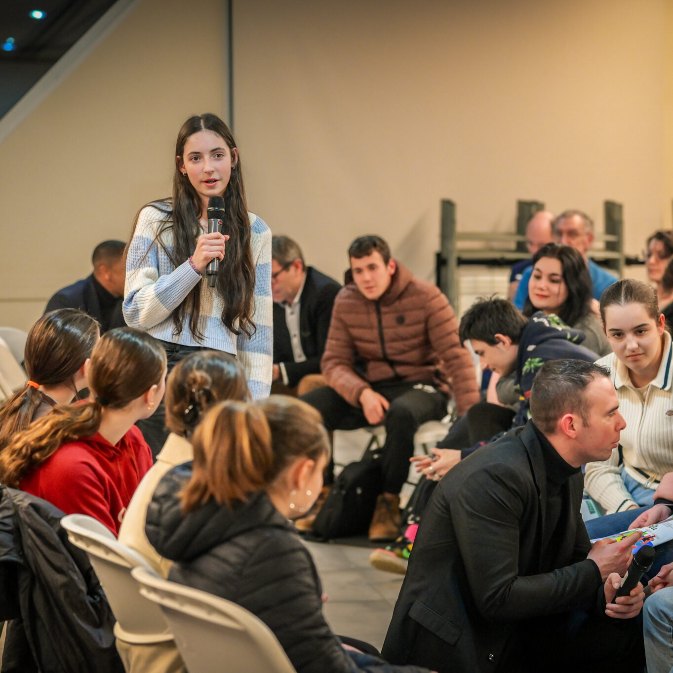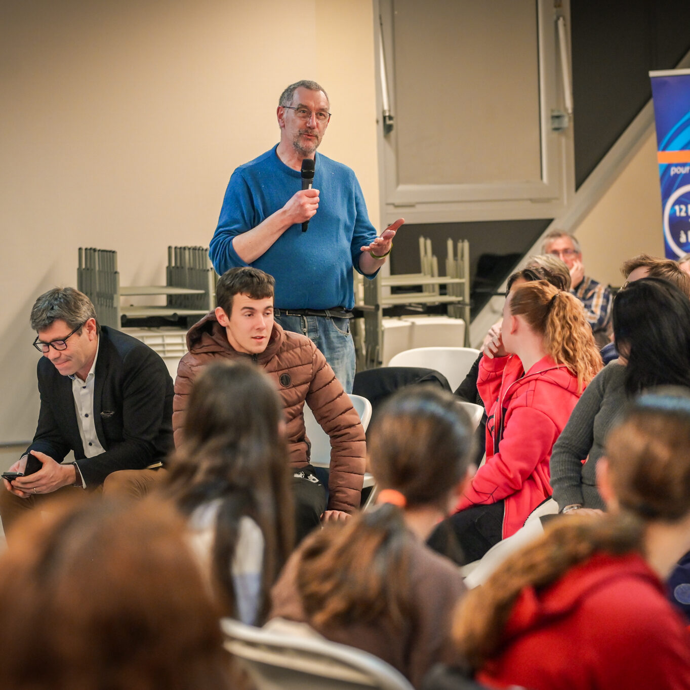 Ce soir, j’entends et je vois beaucoup d’ambitions chez les jeunes, et c’est très agréable. Mais dans mon métier, je vois aussi des jeunes qui ont moins envie, qui ont des craintes, et ce sont eux qu’il faut aller chercher, c’est à eux qu’il faut proposer des ouvertures. Les jeunes que je côtoie au lycée ont souvent l’impression qu’ici tout ne leur est pas ouvert. Je ne m’inquiète pas pour ceux qui sont là ce soir ; s’ils sont venus, c’est parce qu’ils ont envie de s’investir.