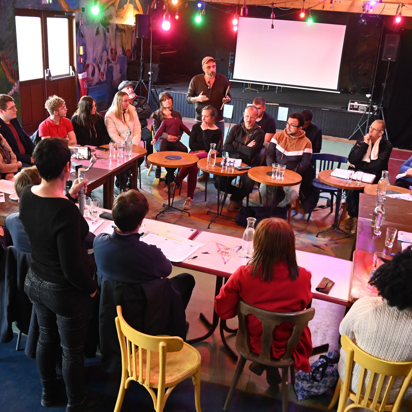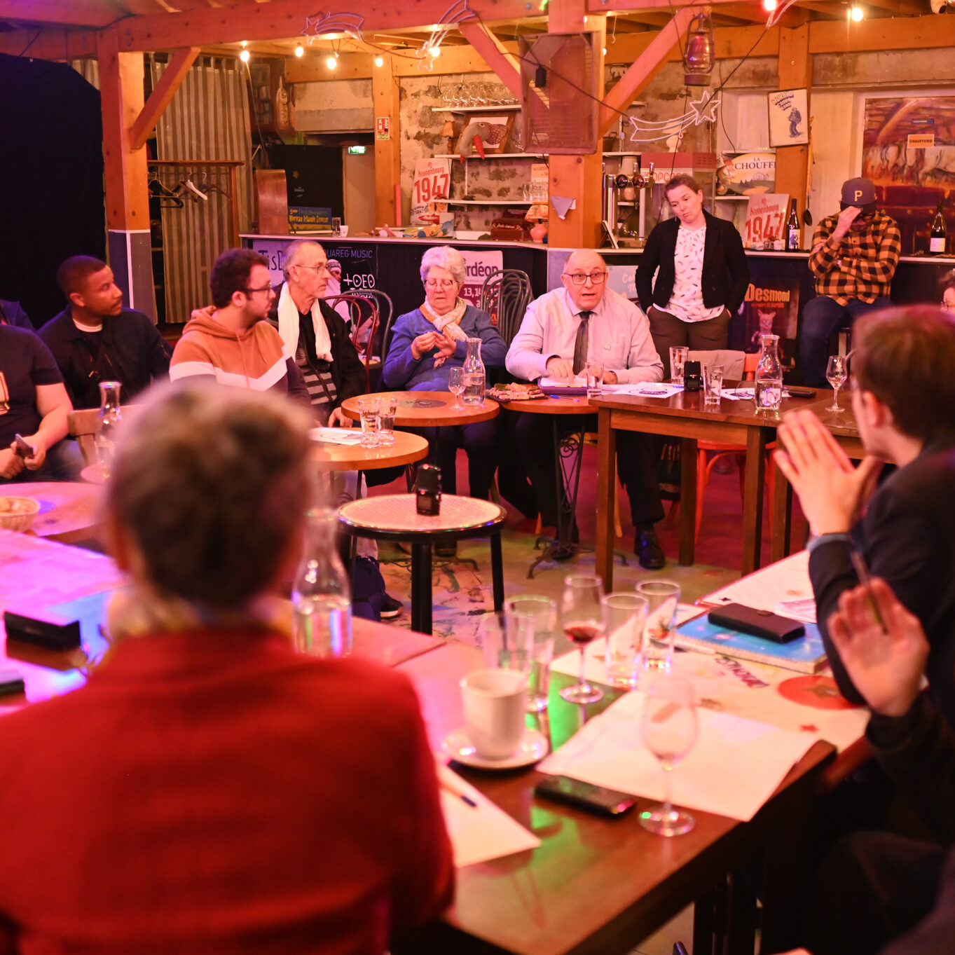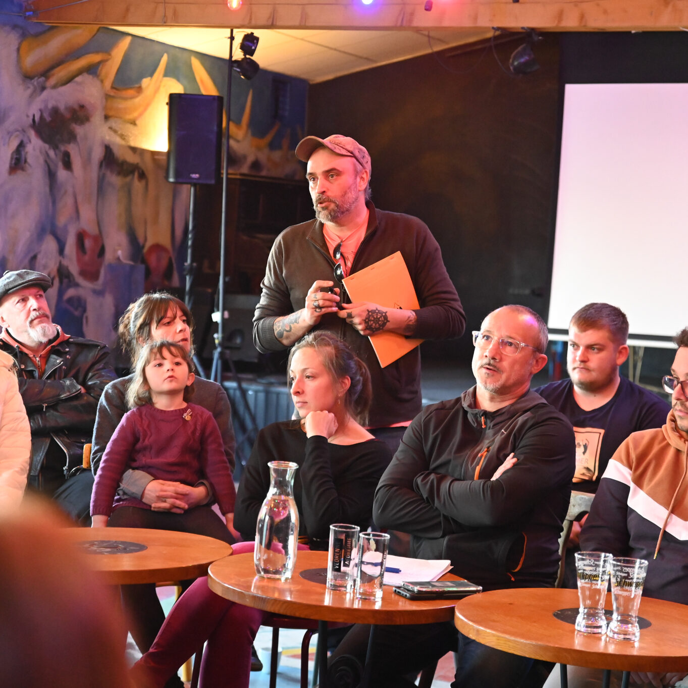 La nouvelle salle de concerts, construite à l’arrière du long bâtiment par les anciens propriétaires, a prêté ses flancs chauds et son plafond égayé de guirlandes d’ampoules multicolores à l’exercice rigoureux de l’évaluation des engagements pris par le Conseil départemental en faveur de la jeunesse. En préambule, Nicolas Petiot a brossé le portrait du Cornemuse et sa ligne directrice depuis la reprise par le trio d’amis, en 2019 : « L’ensemble du projet a été tourné sur la jeunesse, l’engagement et la formation. On accueille des services civiques, des stagiaires, des apprentis. On a également élaboré un programme, les Fondamentaux, où on appelle les gens à partager leurs savoirs, par exemple sur la cuisine, le cinéma, la forêt. Le but, c’est de permettre aux jeunes qui ne fréquentent pas Le Cornemuse de se réapproprier le lieu. »