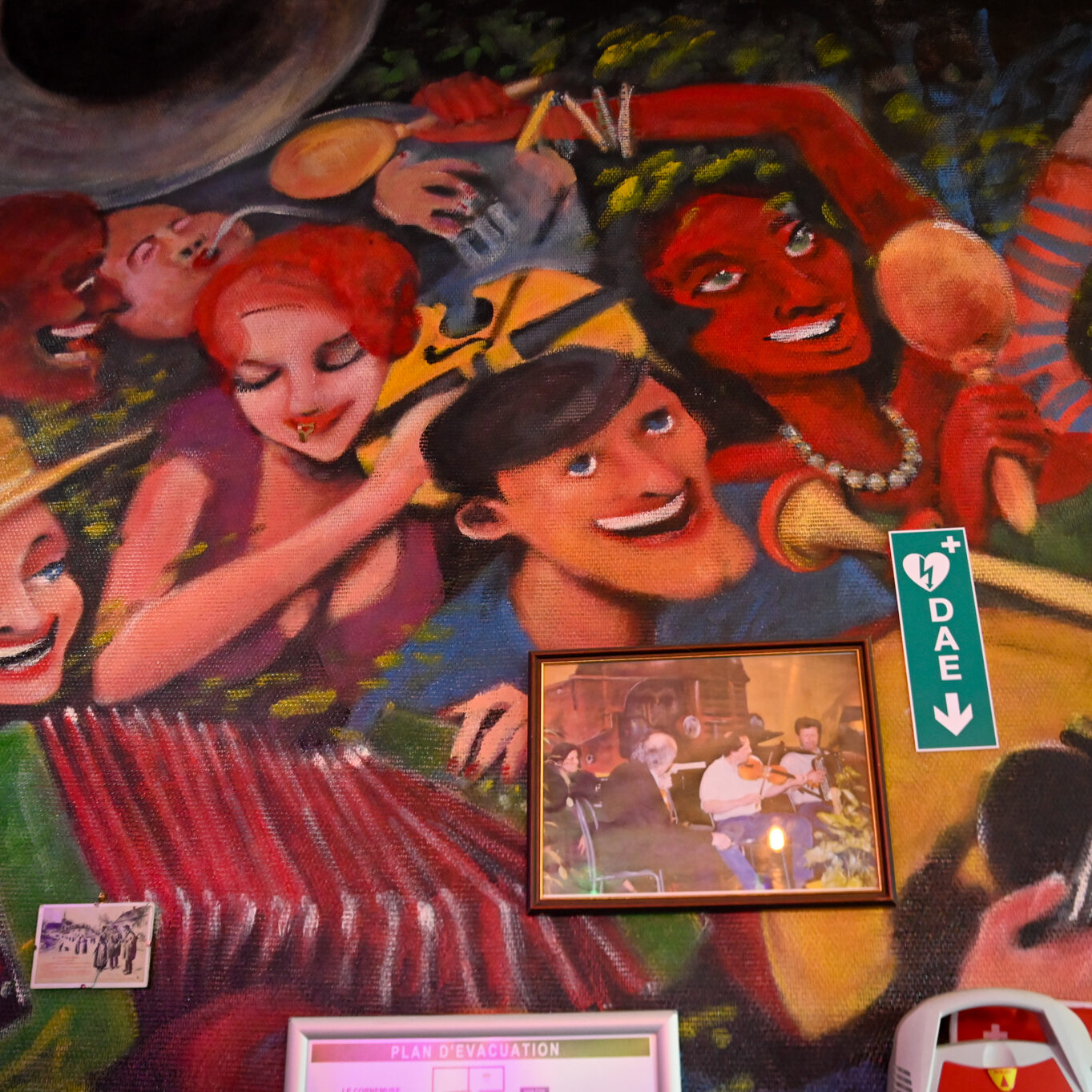 Ses façades tatouées de scènes joyeusement polychromes ralentissent les automobilistes dans Arleuf aussi efficacement qu’un radar pédagogique ou un coussin berlinois. Le Cornemuse fait partie des institutions esthétiques, culturelles et sociales du Morvan et de la Nièvre. Un lieu vibrant d’histoire, de ses vies passées d’Auberge de la Poste puis d’Hôtel de la Poste, dont le parquet résonnait des « guinguettes, des bals et des bœufs », comme l’a rappelé Marine Hadjuk, co-gérante avec Nicolas Petiot et Sylvain Vereycken—Lazou, en accueillant la visite de l’Observatoire des citoyens.