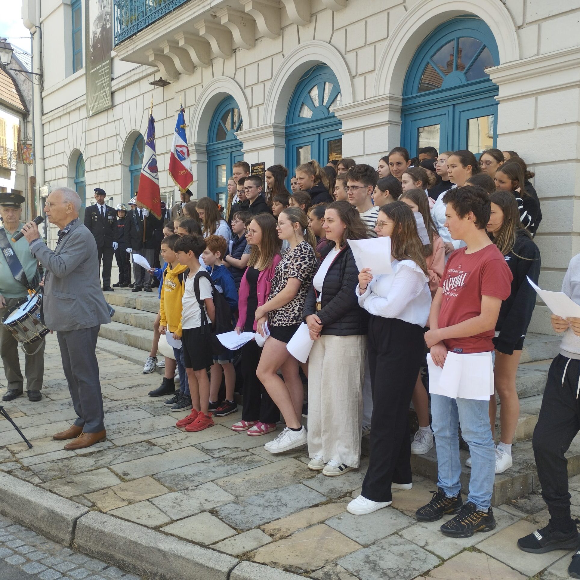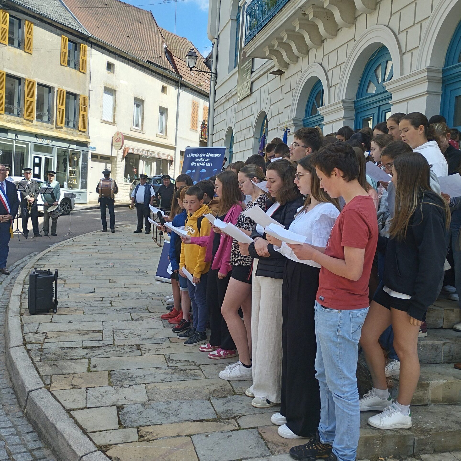 Symboles d’une transmission à l’œuvre, les élèves du collège Paul-Barreau, serrés sur les marches de la mairie, présentent le fruit du travail mené avec leurs enseignants et Aurore Callewaert, directrice du musée de la Résistance en Morvan et du Mémorial de Dun-les-Places : une bande dessinée et des textes, issus d’un atelier d’écriture et lus avec une ferveur adolescente. Accompagnés par la batterie municipale et le chanteur Jean-Michel Grandjean, qui interprète La Plaque, sa chanson hommage au 12 juin 1944, les collégiens referment la cérémonie sur un poignant Chant des partisans.