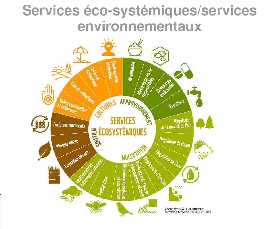 - les services culturels : ce qui nous touche en tant qu’être humain comme la beauté des paysages, une meilleure santé physique et mentale par la pratique d’activités en nature, une inspiration pour l’art et la spiritualité.