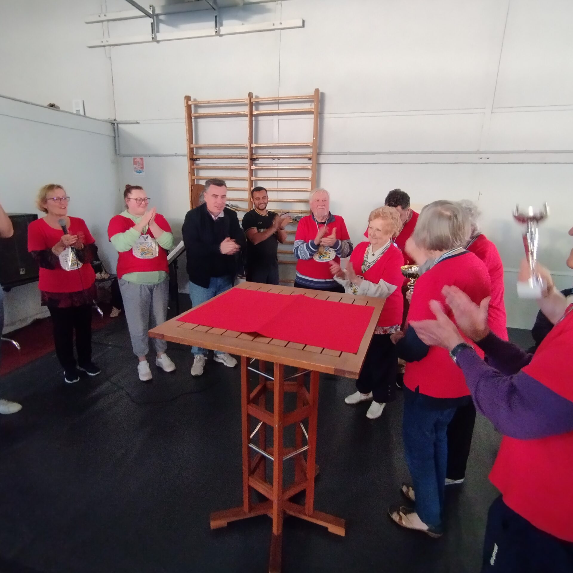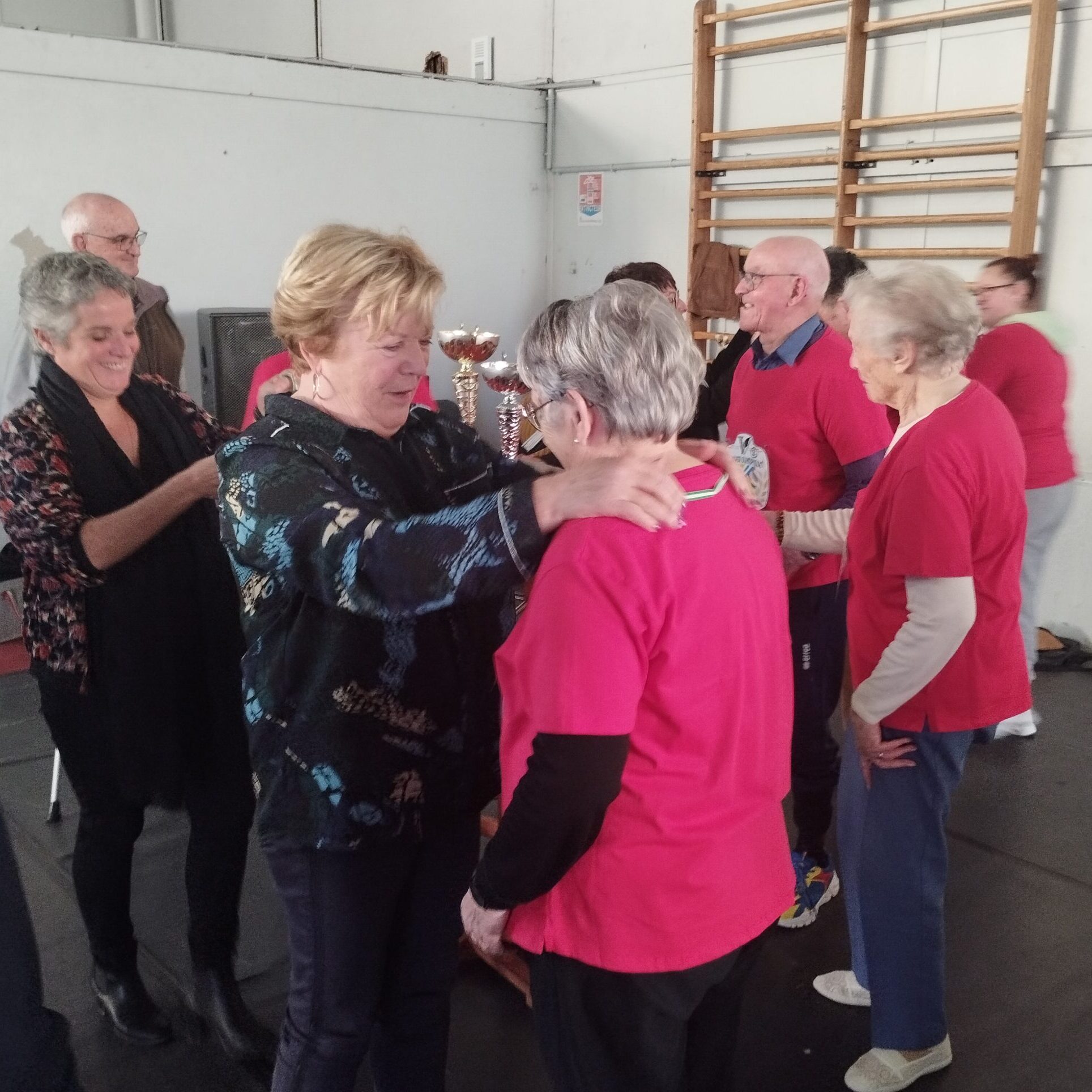Après l’effort… Attablés dans le gymnase Delaune de Varennes-Vauzelles, les seize athlètes résidents savourent tranquillement le goûter en écoutant Sandrine Vallet interpréter quelques tubes de leur jeunesse. Les plus toniques se lancent dans des pas de danse en compagnie des animatrices, en attendant la remise des récompenses par le maire, Olivier Sicot, et la conseillère départementale du canton, Éliane Desabre.