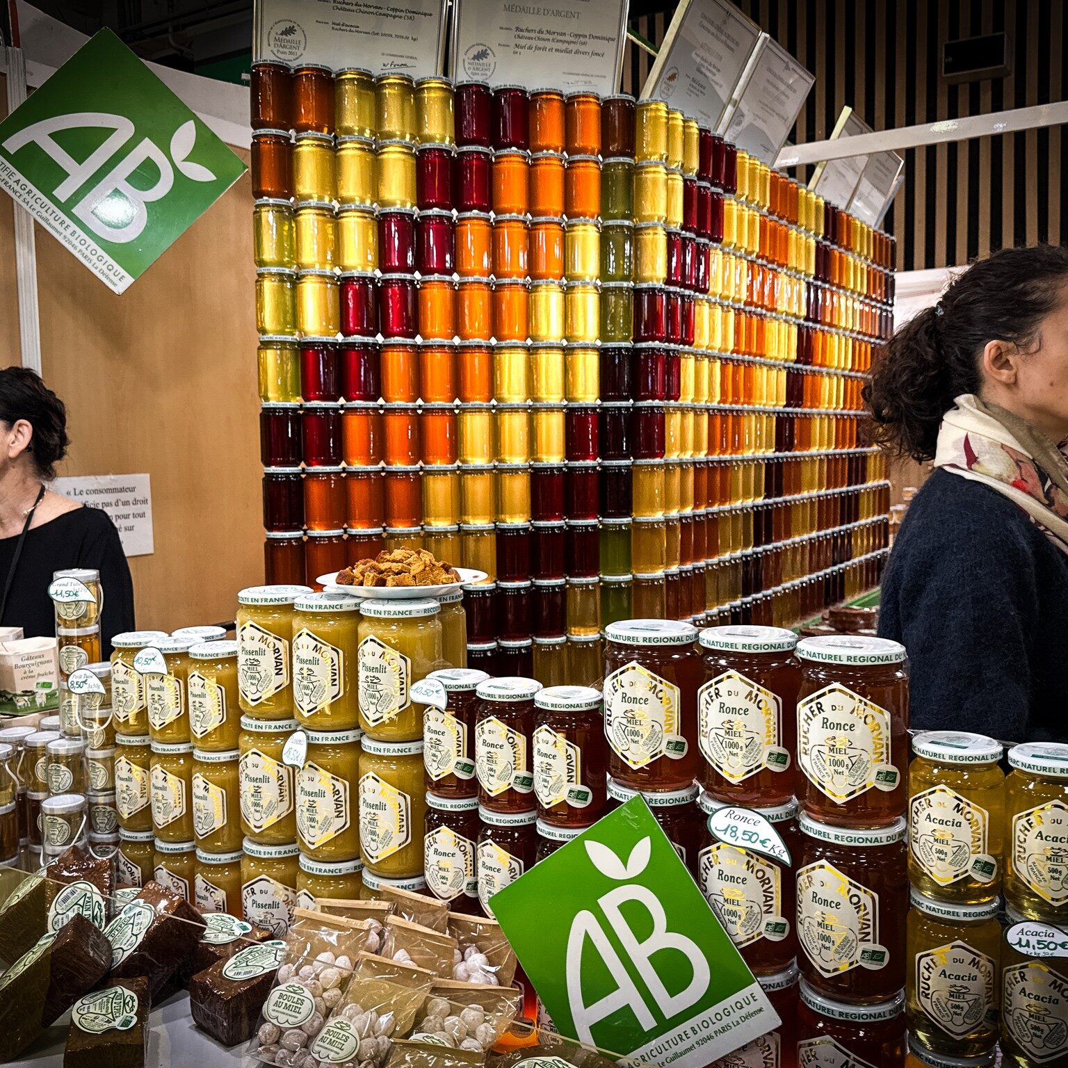 Savamment éclairé, leur mur de bocaux aux teintes douces attire le regard dans l’espace de la Région Bourgogne-Franche-Comté. « Les gens attendent notre mur de miels », sourit Dominique Coppin, qui avec son mari Jean-Jacques a fondé les Ruchers du Morvan en 1977. L’entreprise n’a cessé de croître, comptant aujourd’hui « 1 000 à 1 200 ruches », 14 salariés, et un écomusée de l’abeille qui attire la foule sur les pentes entre Château-Chinon et Corancy : « On a été les premiers à faire la vente à la ferme, en 1978. »