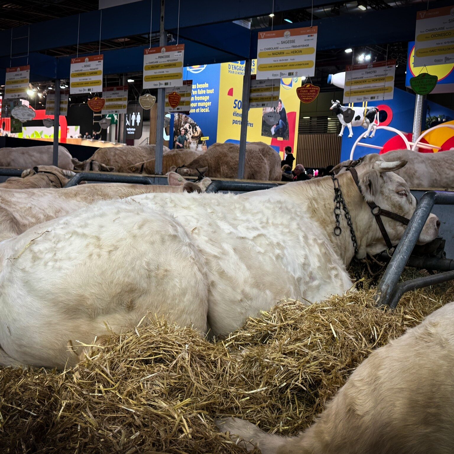Aussi zen que les autres bêtes de concours allongées sur la paille, Sirène somnole, insensible au flot continu des visiteurs dans le Hall 1 du Salon international de l’agriculture. Insensible à la curiosité que suscite la plaque, fraîchement fixée sous la présentation de son pedigree : premier prix de section, la charolaise de 4 ans et de 1 168 kg (son poids à l’arrivée au salon)est couvée du regard par Louanne Touillon, 18 ans, venue de Decize avec ses parents, Jean-Marc et Patricia, sa sœur aînée Anaïs (20 ans) et son petit frère Alban (16 ans) pour la plus grande fête agricole de France.