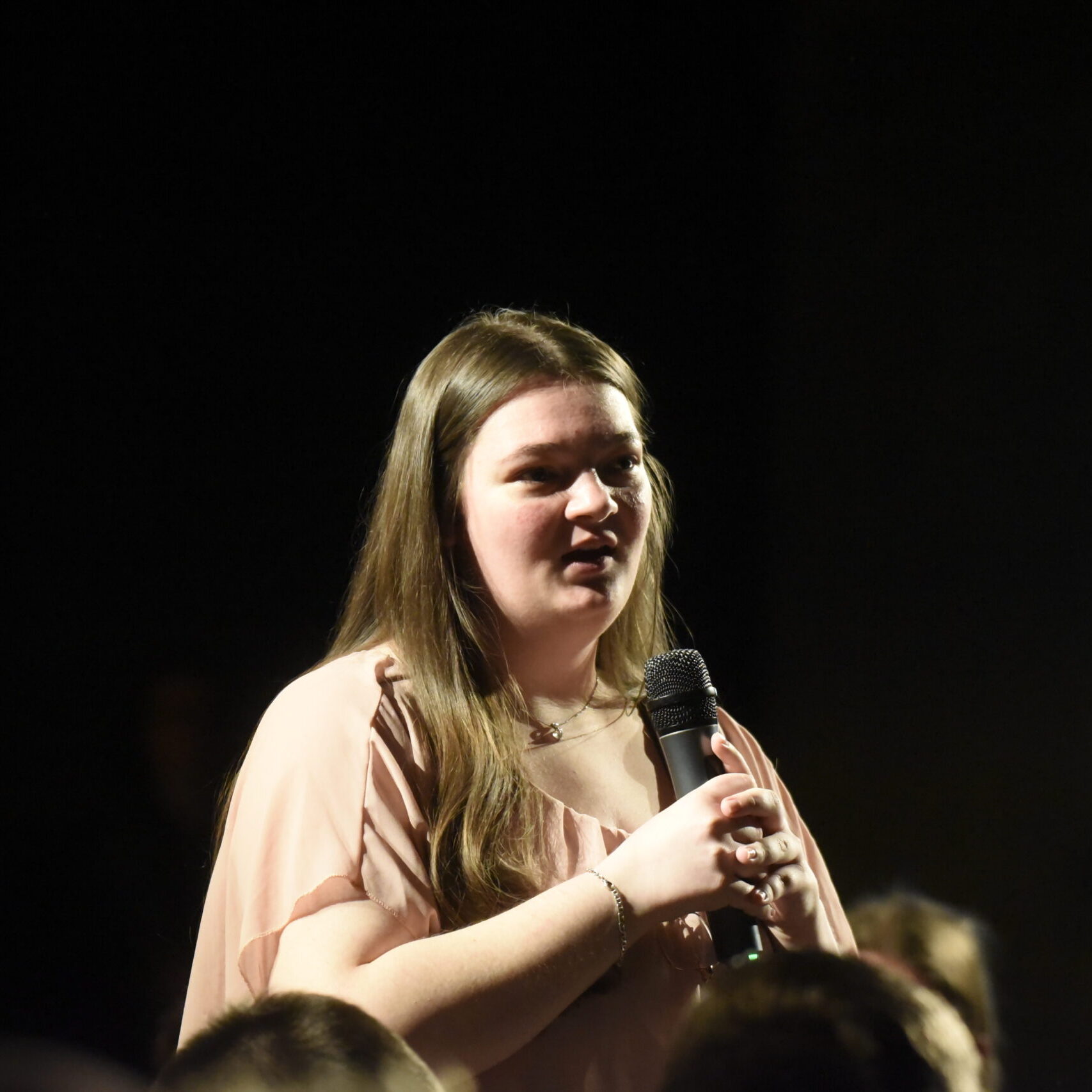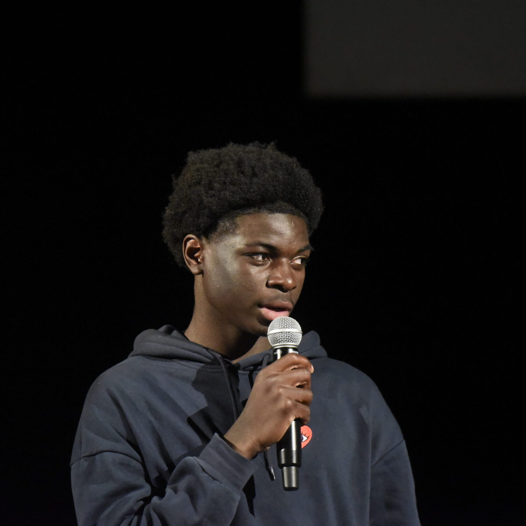 Wilfrid Séjeau, vice-président du Conseil départemental en charge de la jeunesse et « Monsieur Loyal » de la soirée, l’interroge doucement. Son rêve ? « Être dans la musique. Je fais du rap, du slam, en solo. » La vie à Marigny ? « On est bien, c’est la campagne, il n’y a pas trop de trucs dangereux. » La précision fait sourire le public, Lloyd se détend, et se lance : « Je peux faire un slam ? » Sa voisine amorce la bande son sur son smartphone, et fixant un point invisible au fond de la salle, le jeune résident de l’APIAS dit plus qu’il chante sa différence, l’étouffant décalage avec le monde, les autres, les regards, le sentiment de n’être jamais à sa place. Les phrases coulent, limpides, fluides, dans une Transverse suspendue à ses mots. Les applaudissements pleuvent, Lloyd rend le micro et se rassoit, visage illuminé d’un immense sourire.