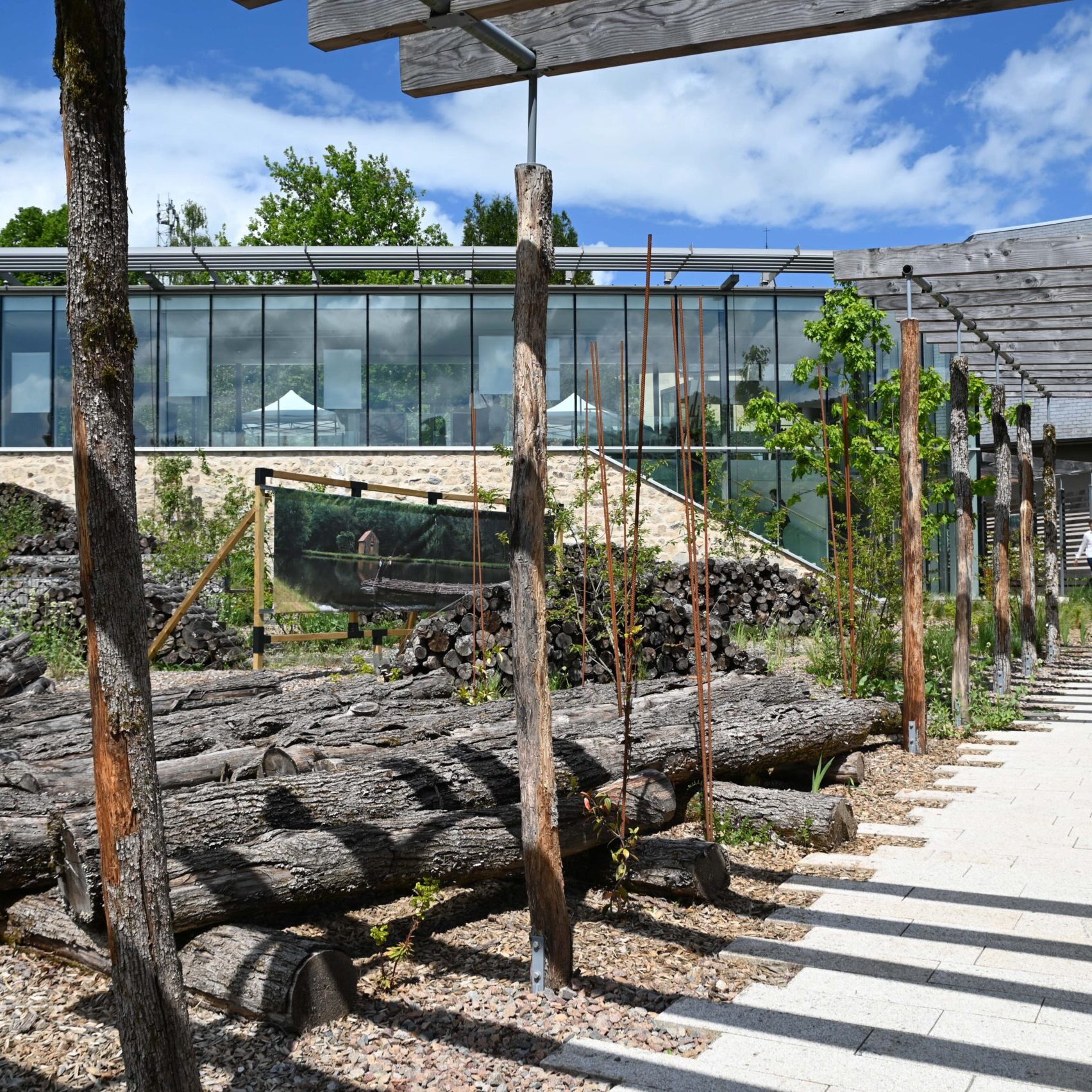 C’est dans un premier espace dégagé, à ciel ouvert surplombant une butte que les visiteurs ont été accueillis. Un nouvel espace extérieur, mais déjà chargé de l’empreinte naturelle de son territoire, avec un pavillon de verre qui accueille l’exposition de l’artiste Claire Xuan, « Petites et grandes histoires du bois sur l’eau ». Constituée de photographies mettant à l’honneur l’eau, le bois et les flotteurs chers à notre territoire, l’exposition sublime le lieu de manière à la fois authentique, et moderne. Cette exposition restera ouverte au public sous forme d’ateliers animés par l’artiste du mardi au samedi de 9h30 à 12h30 et de 14h à 18h.