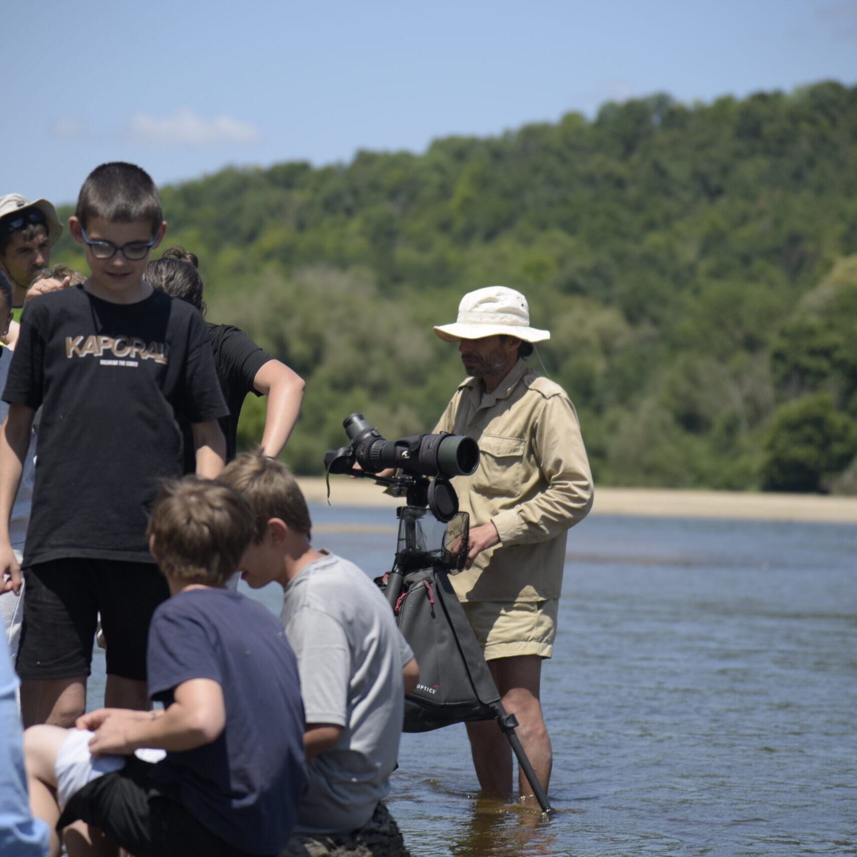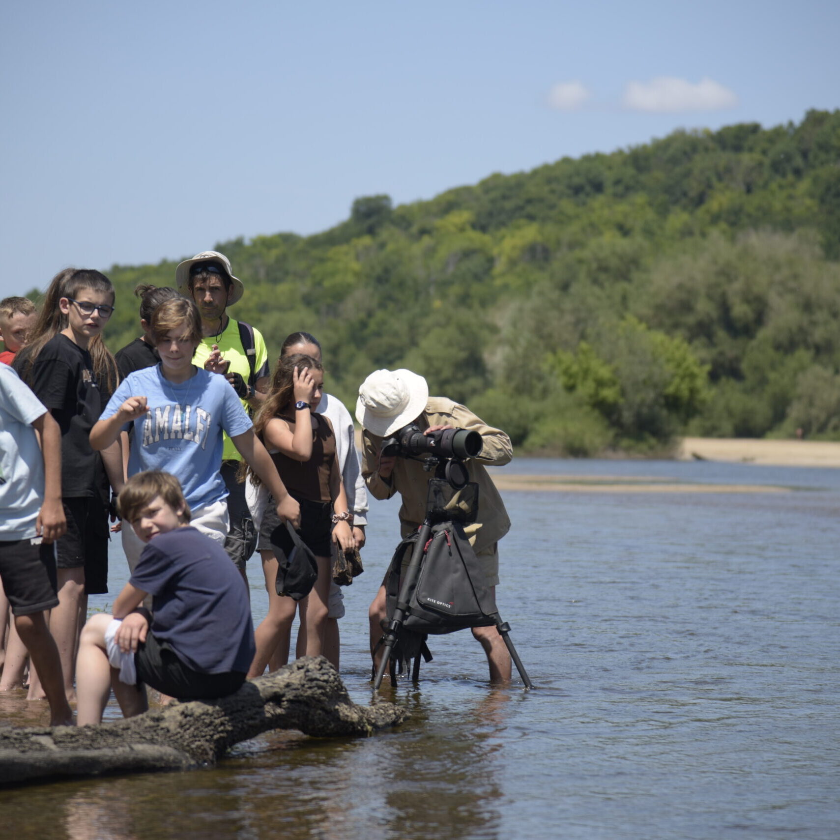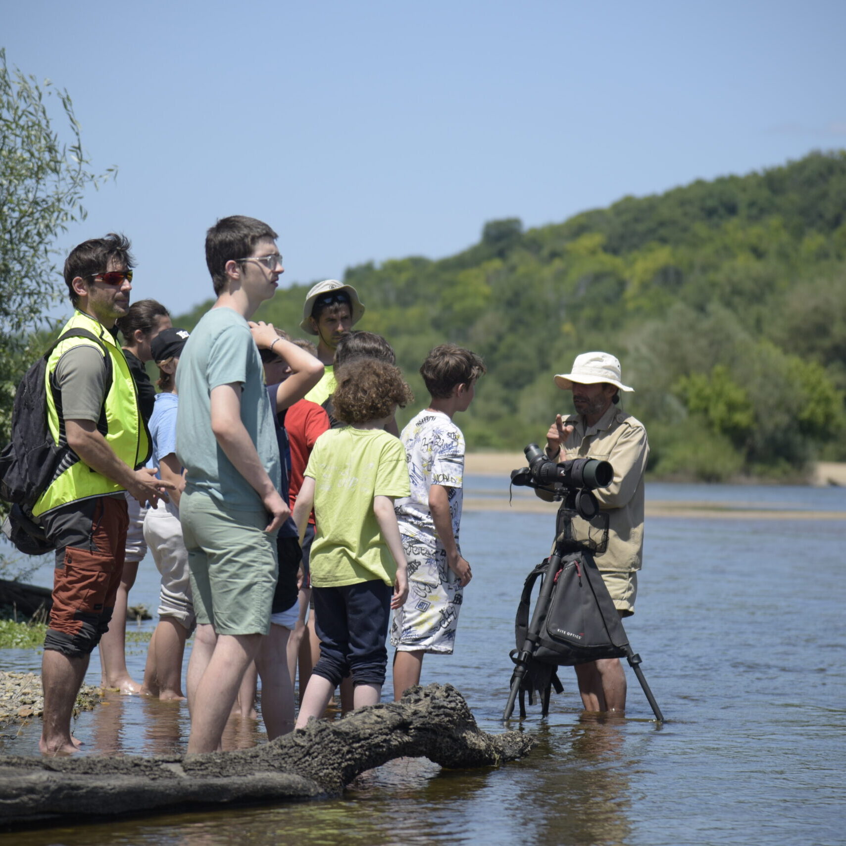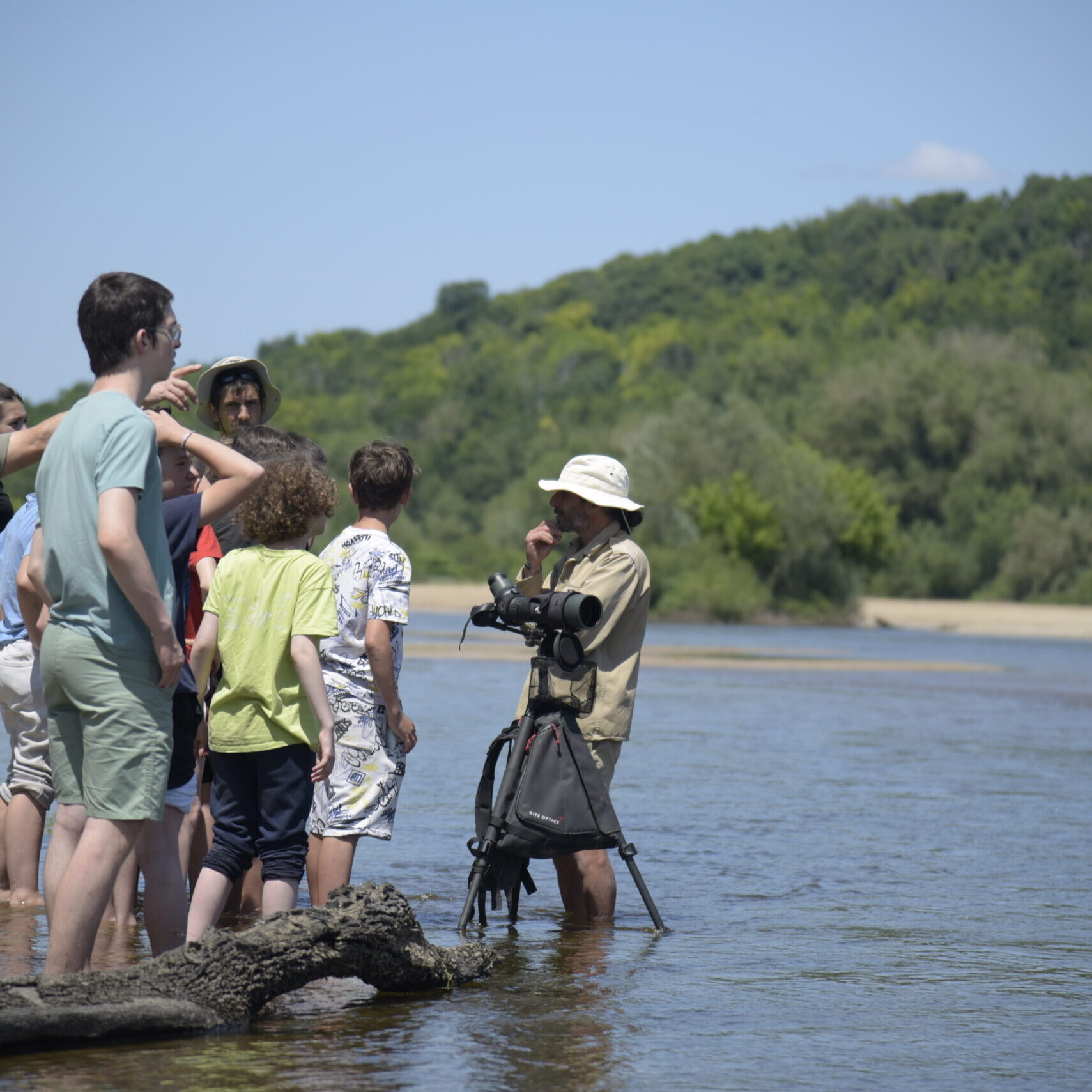 Sur la rive opposée, le guêpier d’Europe n’a pas échappé à l’œil de Christophe Page. « Approchez-vous et regardez », souffle le guide naturaliste aux collégiens qui l’entourent. Dans la longue-vue, la silhouette ronde et multicolore posée sur une branche se détache dans l’azur du ciel. Hirondelle de rivage, gravelot, héron, la faune abritée dans la marqueterie de bancs de sable, de forêt alluviale, de hautes herbes et d’eau révèle quelques secrets aux élèves d’ULIS et de 6e SEGPA (2) du collège Paul-Langevin (Fourchambault).