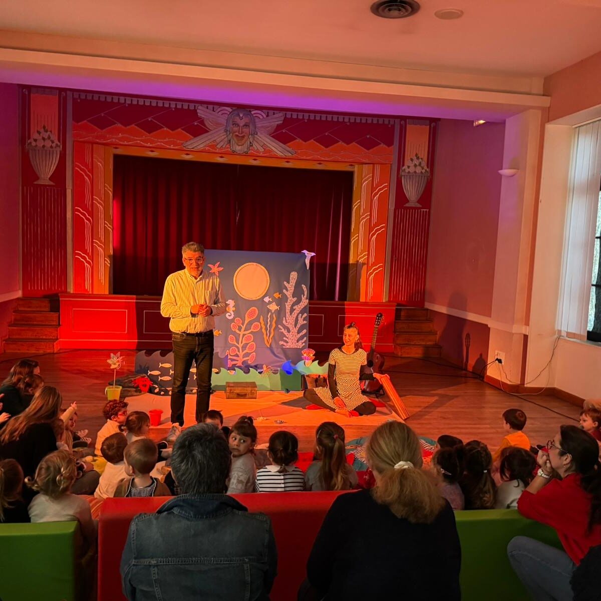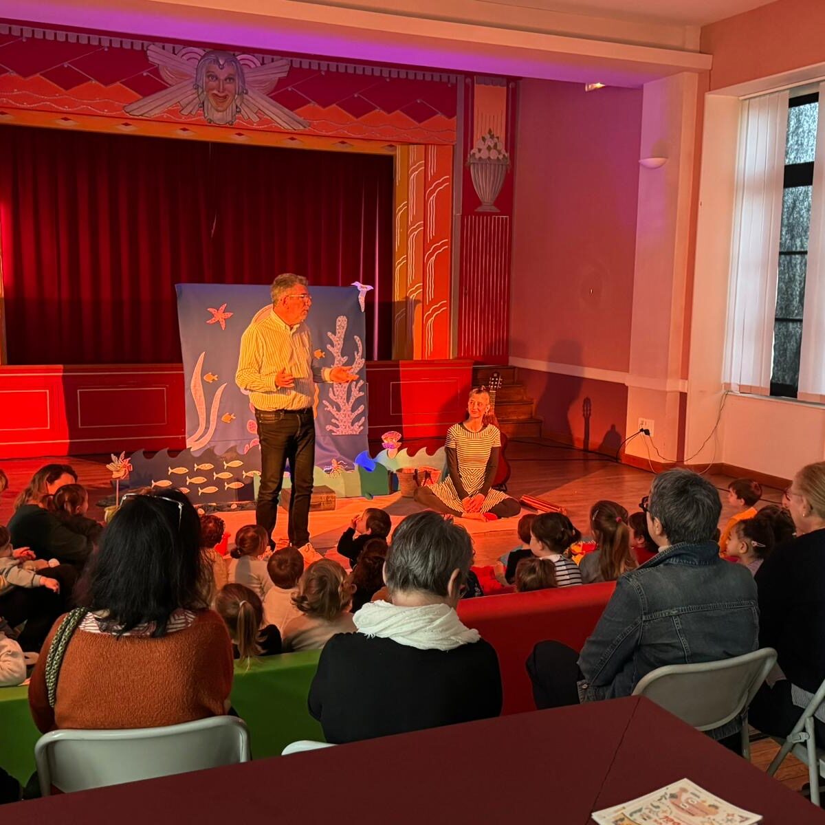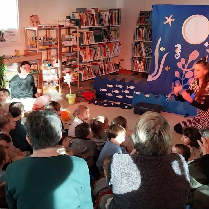 Edgard le Homard et la Coquille dorée, une petite fille et un poisson étouffant dans son bocal : les héros du conte Comme un poisson dans l’eau frétillent désormais dans l’imaginaire des tout-petits spectateurs présents lors des représentations organisées par la Bibliothèque départementale de la Nièvre cette semaine à Saint-Pierre-le-Moûtier, Guérigny, Saint-Léger-des-Vignes et Cercy-la-Tour, en partenariat avec les bibliothèques locales.