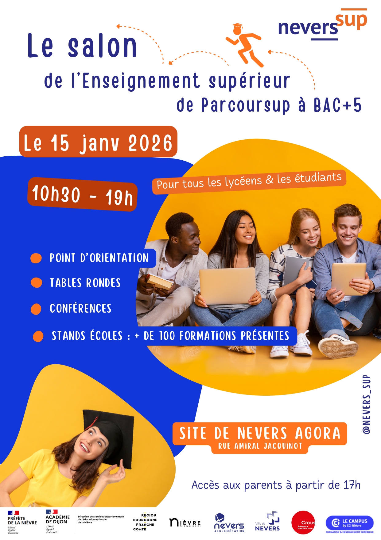De 10 h 30 à 19 heures, 300 exposants et 100 stands seront au menu XXL des 3 000 lycéens nivernais – et des parents, à partir de 17 heures – attendus pour ce « classique » de l’orientation post-bac, orchestré par Nevers Sup avec la direction départementale des services de l’Éducation nationale et plusieurs partenaires, dont le Conseil départemental. À la participation financière à l’organisation, la collectivité ajoutera l’animation d’un stand sur lequel seront présentées les aides du Département dédiées à la jeunesse (permis de conduire, BAFA, Pass à l’international, Initiatives jeunes), l’Observatoire des jeunes citoyens, les rencontres Imagine la jeunesse, le Mag Jeunes.