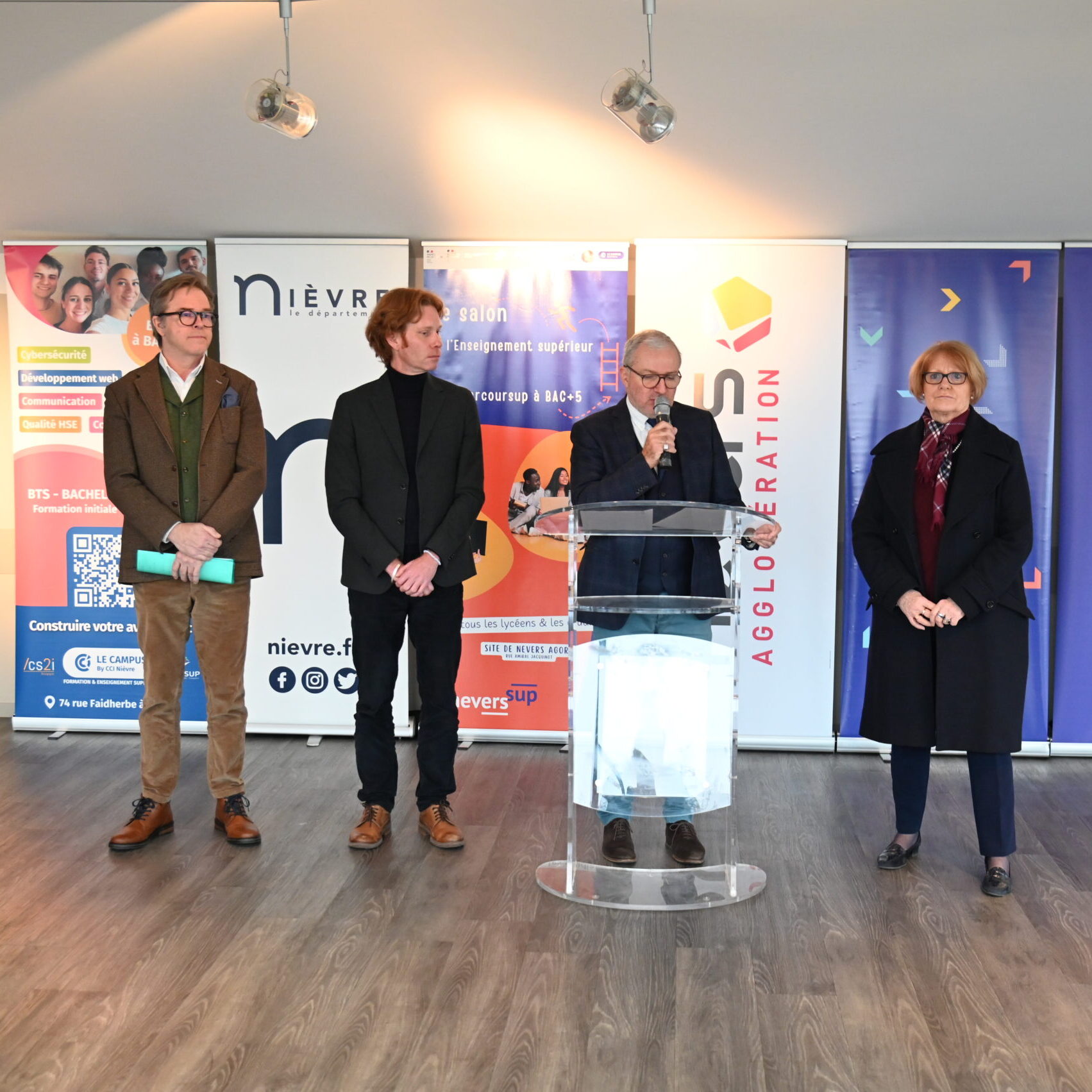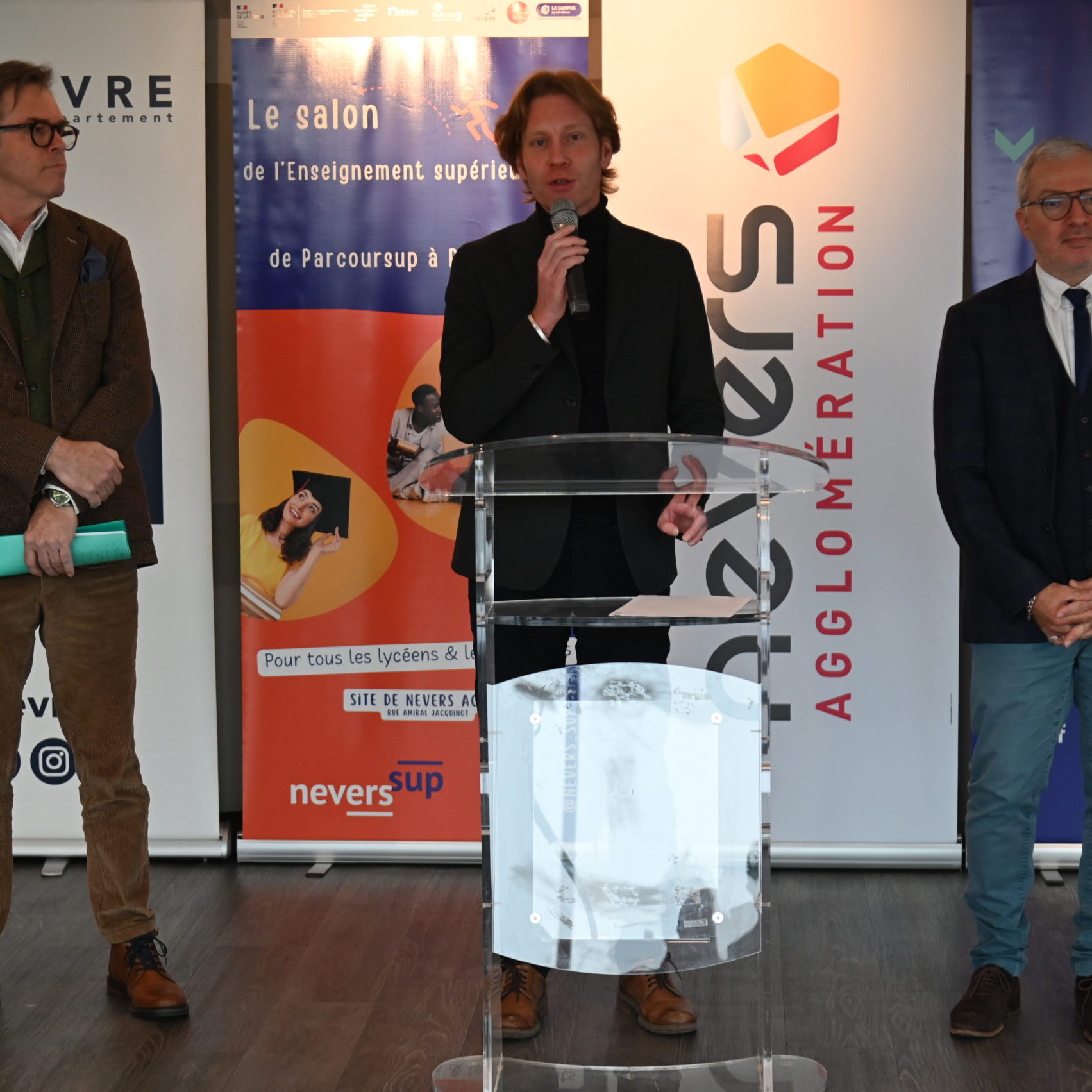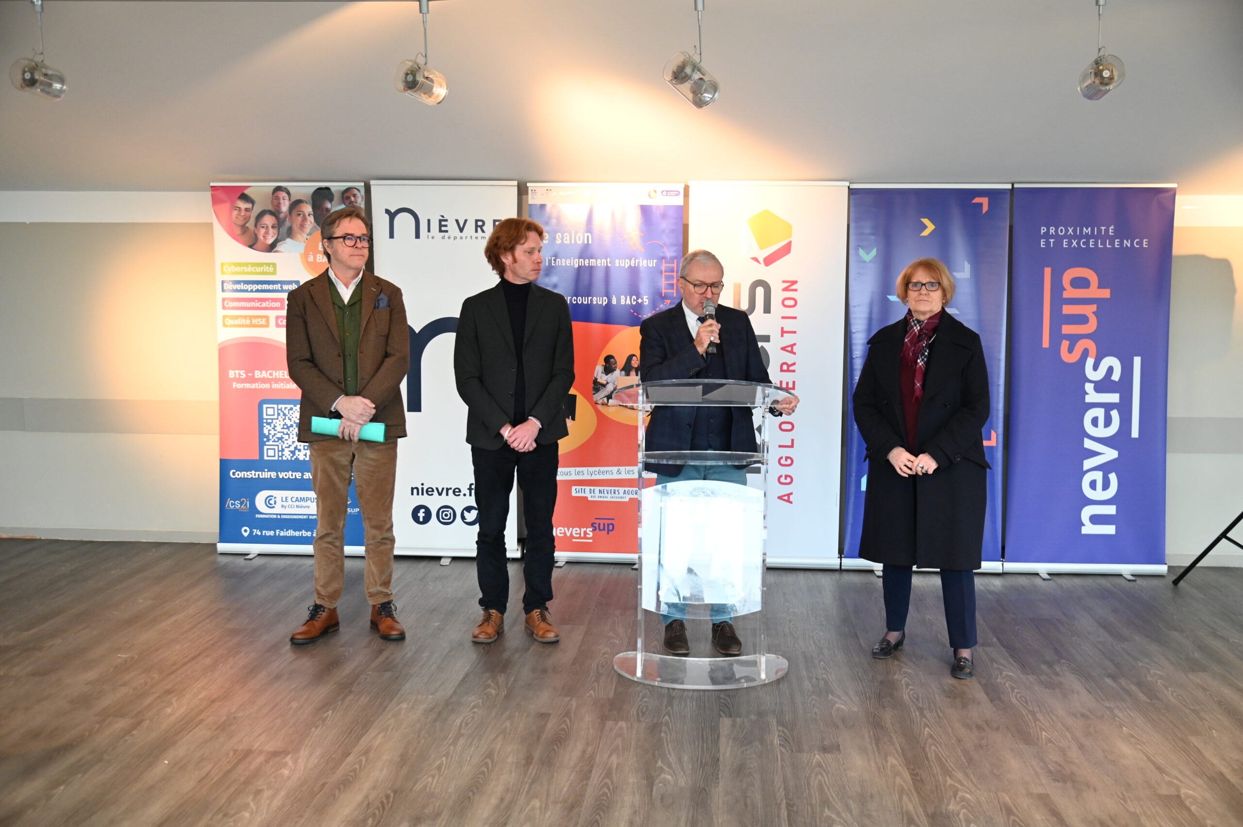 Le programme de ce 11e Salon de l’enseignement supérieur a été dévoilé dans les locaux de Nevers Agglomération, mardi 6 janvier (1). Aux côtés de Denis Thuriot, maire de Nevers et président de Nevers Agglomération, et de Françoise Hervet, vice-présidente en charge de l’enseignement supérieur, Wilfrid Séjeau, vice-président du Conseil départemental en charge de la jeunesse, des collèges et de l’enseignement supérieur, a insisté sur l’engagement du Département, depuis des années, pour le développement des formations sur le territoire, qui facilitent l’accès des jeunes Nivernais aux études de leur choix et qui accentuent l’attractivité de la Nièvre. La possibilité de poursuivre ses études après le bac dans le département est une des attentes récurrentes exprimées par les jeunes lors des rencontres citoyennes Imagine la jeunesse.